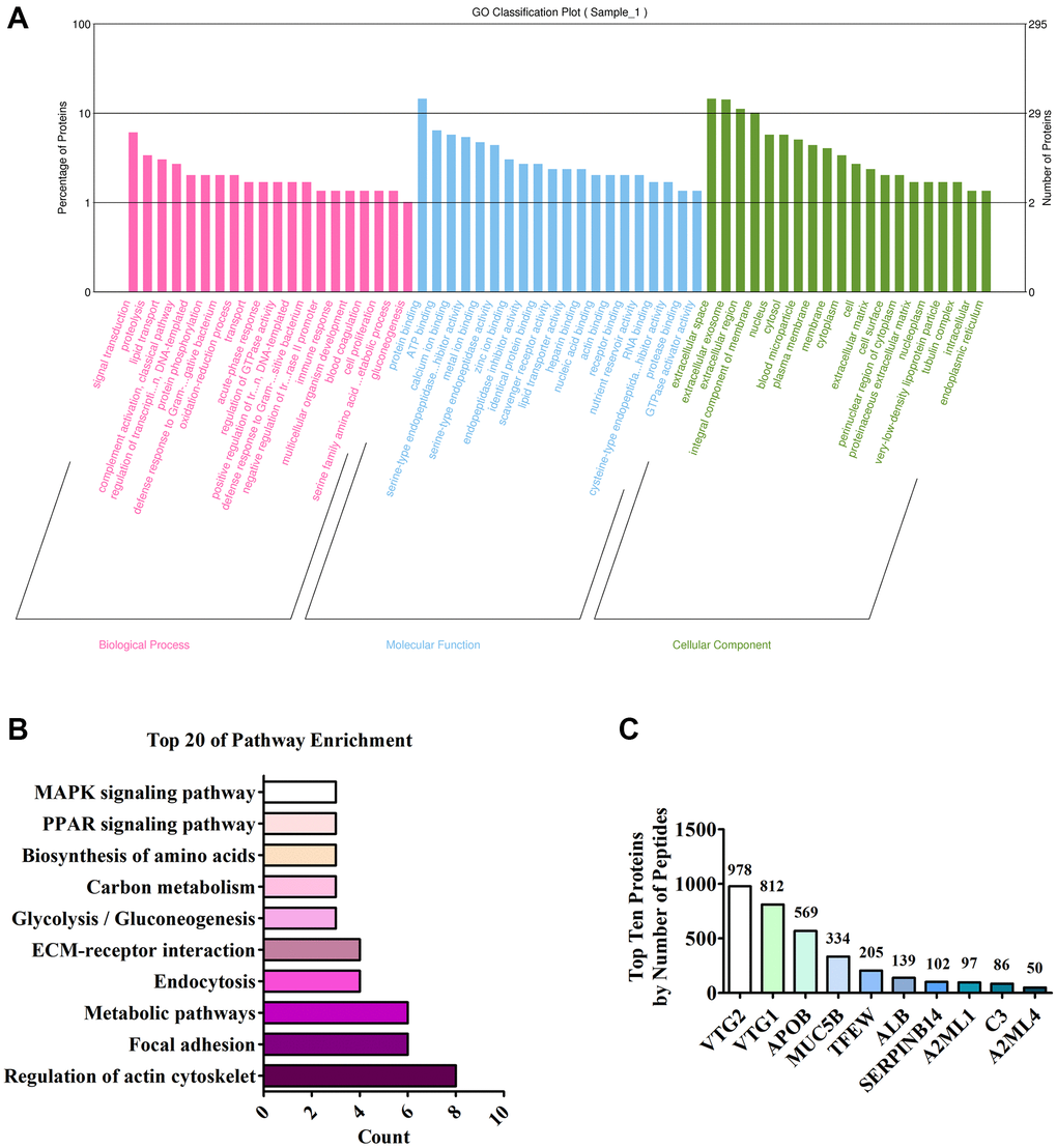 The full spectrum of FEYE was identified using LC MS/MS method to determine which components in FEYE can promote the growth and development of muscle. A total of 296 proteins were screened. In order to understand the function of these proteins, GO analysis was performed on it, showing that these protein were mainly enriched in signal transduction, protein binding, and extracellular space (Figure 4A). In order to understand the main metabolic pathways and signal transduction pathways involved in proteins, enrichment of KEGG Pathway was carried out. It was found that proteins were the most abundant in signal pathways such as regulation of actin cytoskeleton, focal adhesion, metabolic pathways, and endocytosis (Figure 4B). The top ten proteins were listed according to the number of peptides (Figure 4C). See Supplementary Table 1 for details of the top 10 proteins. After analysis, we found that VTG2 protein is the most abundant component in FEYE. Therefore, we predicted that VTG2 protein played an important role in muscle growth and metabolism.