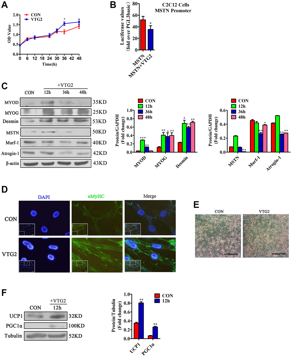 To confirm the effective concentration of VTG2 in C2C12 cells, we diluted it to 0, 0.5, 5, 50, and 500 ng/mL and added it to C2C12 cells at the concentration gradient. We found that when the concentration of VTG2 was 5 ng/ mL, the factors such as MSTN, MYOD and MYOG changed most significantly (Supplementary Figure 2). Therefore, we finally determined that the effective concentration of VTG2 was 5 ng/mL. In order to prove whether VTG2 plays a role in vitro, the results of the CCK-8 method showed that compared with the control group, the proliferation rate of the VTG2 group was faster, and it was most obvious at 36 h (Figure 5A). In order to verify the relationship between VTG2 and MSTN, the C2C12 cells were co-transfected with MSTN promoter and VTG2. The result of luciferase assay showed that VTG2 directly inhibited the transcription activity of MSTN (Figure 5B). Later, we found that VTG2 in C2C12 cells further promoted the protein expression of MYOD, MYOG and Desmin, and inhibited the expression of MSTN, Murf-1 and Atrogin-1 (Figure 5C), and the effect was most obvious at 36 h, which is consistent with the CCK-8 assay. In addition, when VTG2 was added to the differentiation medium of C2C12 cells for 36 h, the results showed that VTG2 accelerated the formation of C2C12 cells myotubes (Figure 5D). Hence, when the concentration is 5 ng/mL, VTG2 can directly inhibit the transcription of MSTN and promote the proliferation of C2C12 cells and the formation of myotubes.
