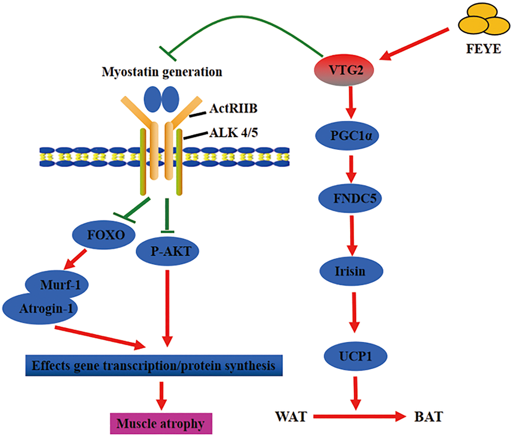 In short, FEYE fed to mice not only inhibited muscle atrophy, but also caused browning of WAT. The two different results may be mediated by the same factor (Figure 6). This work enhances our in-depth understanding on the function of FEYE. In addition, some functions of VTG2 were discovered through the study of FEYE. The above results has important scientific significance for improving human muscle atrophy and muscle growth retardation. At the same time, these results play an important role in promoting the development of animal husbandry meat products, and even turning VTG2 into a healthy product for future consumption.