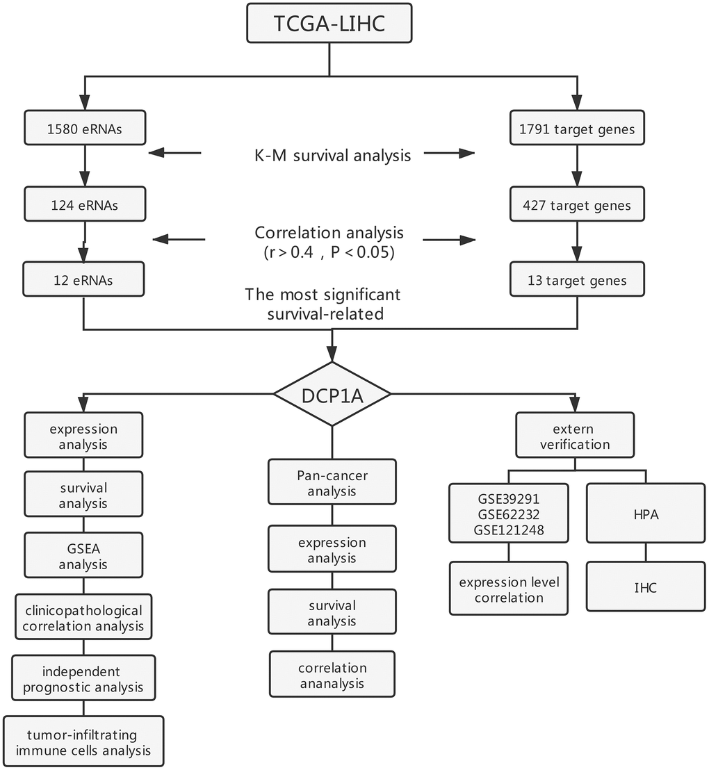 The present study used bioinformatics analyses to screen a series of eRNAs and target genes correlated with prognosis in HCC patients. The eRNA DCP1A was found to be the most significant survival-associated eRNA in HCC that could serve as an independent unfavorable prognostic factor in HCC. Therefore, for the first time, the findings of the current study show that the eRNA DCP1A is a potential novel biomarker and therapeutic target for HCC patients.