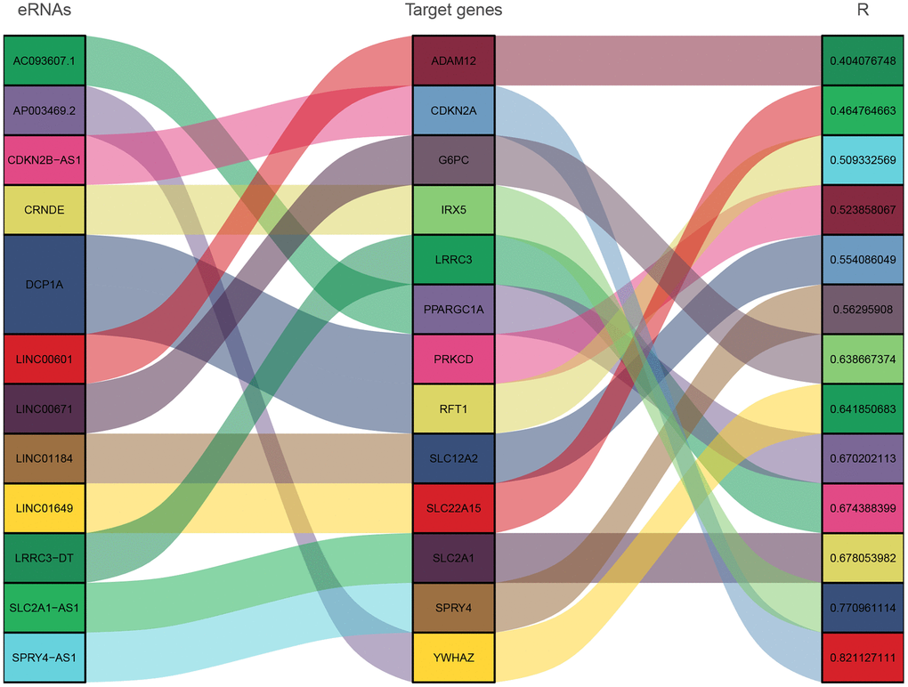 Spearman correlation analysis was performed using R software (v 4.0.2) to explore the relationship between prognostic eRNAs and target genes. eRNAs correlated with target genes were screened using the following criteria: spearman r>0.4 and P<0.05. Correlated gene pairs were presented in a Sankey diagram.