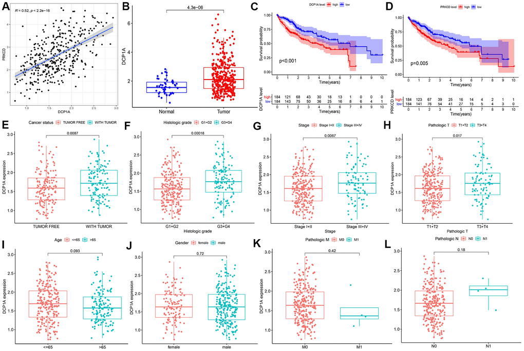 The mRNA-decapping enzyme 1a (DCP1A) was identified as the significantly associated survival eRNA with the least P-value among the 12 eRNAs. Expression level of DCP1A was positively correlated with expression levels of its predictive target genes, PRKCD and RFT1 (Table 1). This finding indicates that eRNAs do not only regulate specific genes, and one eRNA can regulate expression levels of multiple target genes. Therefore, the eRNA DCP1A and the target gene with a higher correlation (PRKCD) were chosen for further analysis (Figure 3A). Expression data of DCP1A were retrieved from HCC and normal samples and differential expression analysis was performed. The findings showed that DCP1A was significantly highly expressed in tumor tissues compared with the expression level in normal tissues (P<0.001, Figure 3B). Kaplan-Meier survival analysis showed that high expression of DCP1A was correlated with poor prognosis (P<0.001, Figure 3C) and the higher PRKCD expression was correlated with shorter OS (P=0.005, Figure 3D). The relationship between DCP1A gene expression and clinicopathological characteristics was explored. Clinical information of TCGA-LIHC cohort is presented in Table 2. The findings showed increased expression of DCP1A was significantly correlated with the cancer status (P=0.0087, Figure 3E), histological grade (G3/G4 vs G1/G2, P<0.001, Figure 3F), AJCC stage (stage III/IV vs stage I/II, P=0.0067, Figure 3G) and T stage (T3/T4 vs T1/T2, P=0.017, Figure 3H). However, there was no correlation between age, gender, M stage, N stage and DCP1A expression (P>0.05, Figure 3I–3L).