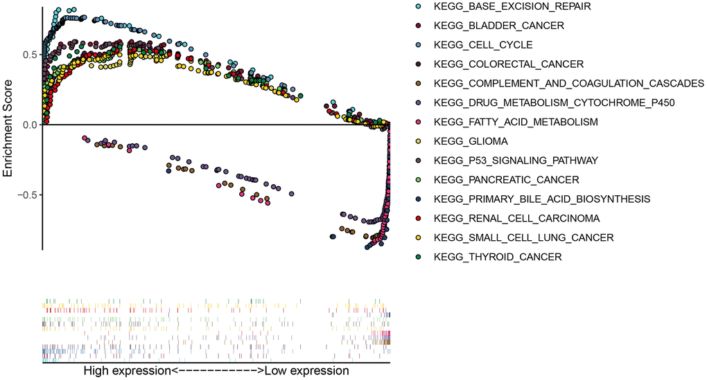 Gene set enrichment analysis (GSEA) was performed using GSEA software to explore the biological pathways associated with the identified key eRNA. Subjects were assigned into high and low expression phenotypes based on the median expression values of the key eRNA. Enrichment analysis was carried out using the default parameter settings. The random number was set at 1000 times. Gene sets with FDR<0.05 were identified as significantly enriched gene set in GSEA.