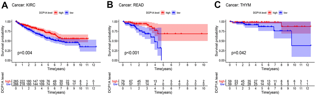 The prognostic significance of DCP1A in pan-cancer data was explored using Kaplan-Meier and log-rank tests (Supplementary Table 1). The patients were divided into high and low expression groups according to the median of DCP1A expression level. The DCP1A has prognostic significance in kidney renal clear cell carcinoma (KIRC), rectum adenocarcinoma (READ) and thymoma (THYM) (Figure 6), the high expression of DCP1A were associated with the observed favorable prognosis.