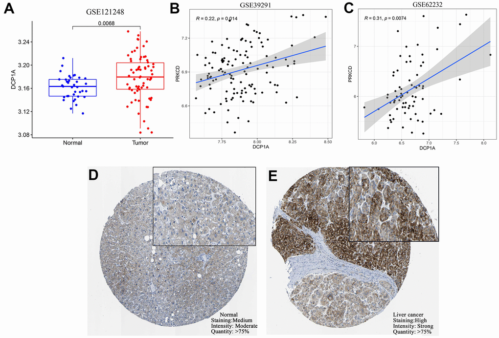 GSE121248, GSE39291, and GSE62232 datasets were retrieved from GEO database for external validation of the differential expression of DCP1A between HCC tissues and adjacent normal tissues and to further explore the correlation between DCP1A expression level and the target gene, PRKCD. Analysis showed that DCP1A was highly expressed in liver cancer tissues and its expression level was positively correlated with expression of PRKCD (P<0.05, Figure 7A–7C) in which was consistent with the findings using TCGA dataset. Moreover, IHC data of DCP1A in HCC tissues and normal tissues were retrieved from HPA. Analysis of IHC data showed that DCP1A protein was highly expressed in HCC tissues (Figure 7D, 7E).