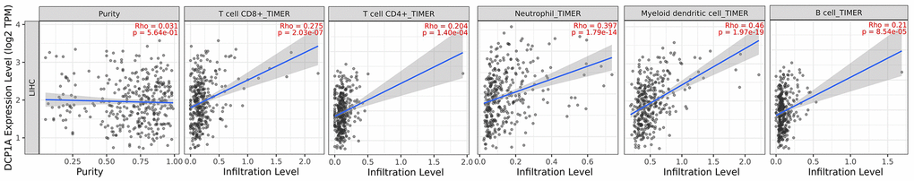 TIMER 2.0 (http://timer.cistrome.org/) was used to explore the relationship between DCP1A expression level and abundance of tumor-infiltrated immune cells (CD4+ T cells, CD8+ T cells, B cells, neutrophils, dendritic cells). The findings showed a positive correlation between DCP1A expression level and abundance of different type of immune cells (P<0.05, Figure 8).