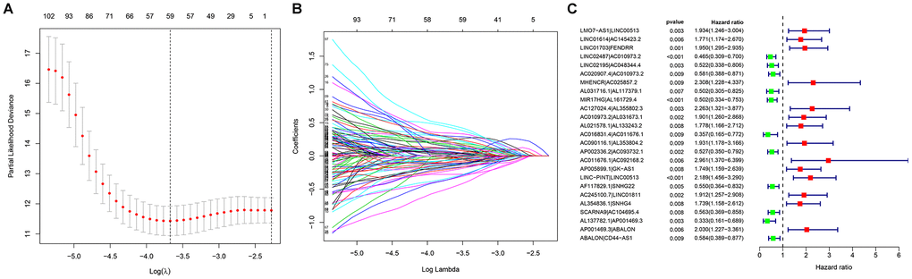 Identification of the frlncRNAs was performed using Pearson correlation to assess the relationship between the ferroptosis-related genes and long non-coding RNAs. The absolute value of correlation coefficients >0.4 and P<0.001 were considered statistically significant. The significant thresholds of DEfrlncRNAs were set as |log2FC| >1.5 and false discovery rate (FDR) <0.001. Subsequently, we established frlncRNA pairs based on these DEfrlncRNAs, as previously described [24]. All the DEfrlncRNAs were cyclically paired and assigned a value according to pairwise comparison in accordance with the following rules: assume that lncRNA A and lncRNA B were paired together as lncRNA pair C, which was assigned a value of 1 if the expression level of lncRNA A was higher than lncRNA B; otherwise, it was assigned a value of 0. If a lncRNA pair had a 0 or 1 ratio of less than 20% or greater than 80% in all samples, it was filtered. Cox regression analyses were performed to evaluate the prognostic value of frlncRNA pairs (P<0.01).