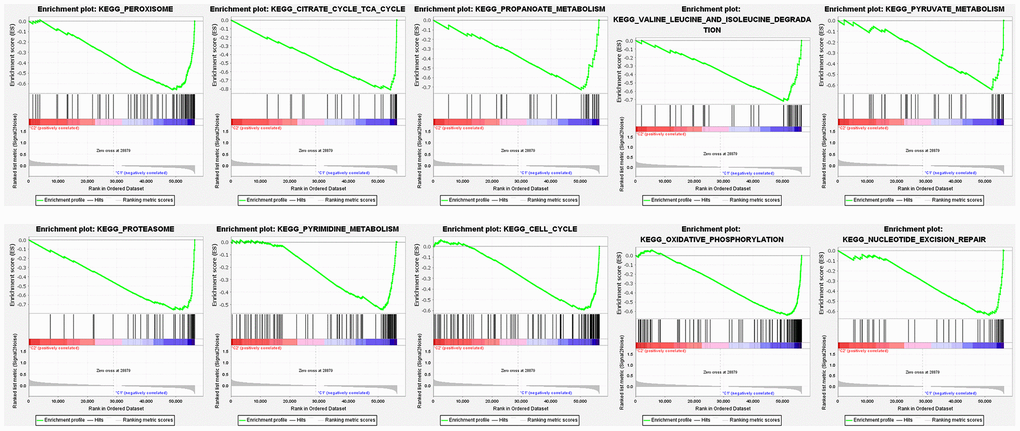 The GSEA results indicated that the high-risk score group had markedly negative correlations with 26 enrichment pathways (Supplementary Table 11). As showed in Figure 10, the top 10 KEGG pathways included “peroxisome,” “citrate cycle,” “cell cycle,” “oxidative phosphorylation,” “nucleotide excision repair,” and metabolism-related signaling pathways such as “propanoate metabolism,” “valine leucine and isoleucine degradation,” “pyruvate metabolism,” “pyrimidine metabolism,” and so on.