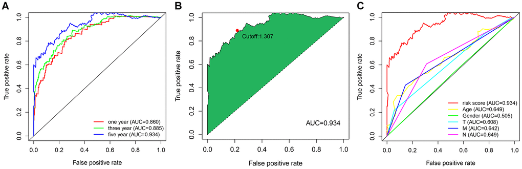 To explore a more objective prognostic evaluation model that did not require the specific expression values to be normalized, a 0-or-1–matrix of 7543 frlncRNA pairs was constructed (Supplementary Table 4). According to univariate Cox proportional hazards regression analyses, 148 frlncRNA pairs were considered to be prognostic-associated lncRNA pairs (Supplementary Table 5). In training cohort, after the least absolute shrinkage and selection operator (LASSO) regression analysis, a prognostic signature including 44 frlncRNA pairs was established (Supplementary Table 6). The AUC representing the predictive value of the risk score model for 1-year survival rate in training and validation cohort were 0.904 and 0.728, respectively (Supplementary Figure 3A, 3B). Survival analyses showed significant difference between the high- and low-risk groups both in training and validation cohort (Supplementary Figure 3C, 3D). Subsequently, we constructed a risk score model based on the data of entire cohort (Figure 1). The list of 25 frlncRNA pairs and their corresponding calculation coefficients are shown in Table 2. The AUCs for 1-, 3-, and 5-year survival rates were 0.860, 0.885, and 0.934, respectively (Figure 2A). Furthermore, we identified the maximum inflection point of 1.307 as the optimal cut-off point on the 5-year receiver operator characteristic (ROC) curve (Figure 2B). Moreover, our results showed that the risk score model was significantly superior to the common clinicopathological characteristics, including age, gender, T status, N status, and M status in predicting the OS of COAD patients (Figure 2C).