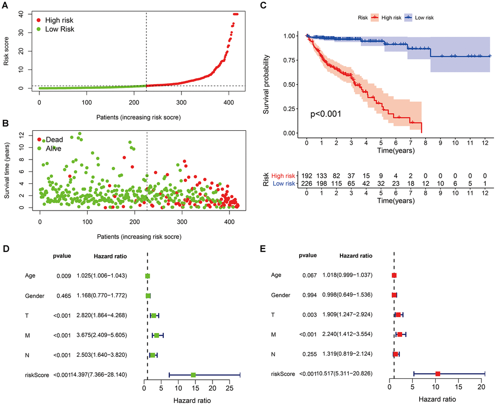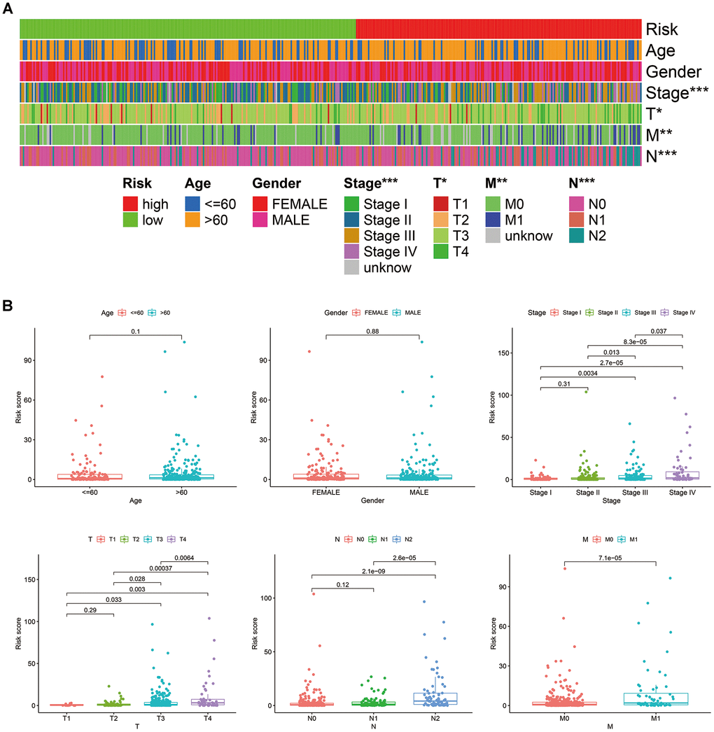 According to the cut-off point recognized previously, 226 patients were classified into the low-risk group and 192 into the high-risk group (Supplementary Table 7). The risk assessment model for prognosis prediction demonstrated that the number of deaths increased with an increase in the risk score (Figure 3A, 3B). Survival analysis revealed that the high-risk group had significantly worse OS than low-risk group (Figure 3C). Age, T status, N status, M status, and risk score model were identified as significant risk factors in the univariate analysis (all P<0.01) (Figure 3D). The risk score model, T status and M status were confirmed as independent prognostic factors by multivariate analysis (all P<0.01) (Figure 3E). Furthermore, our results showed that the risk score model was significantly related to T status, N status, M status, and stage (Figure 4). Moreover, an accurate prognostic nomogram incorporating the risk score model and common clinicopathological characteristics was established for predicting 1-, 3-, and 5-year OS probability, which might be well applied in the clinical evaluation of COAD patients (Figure 5).