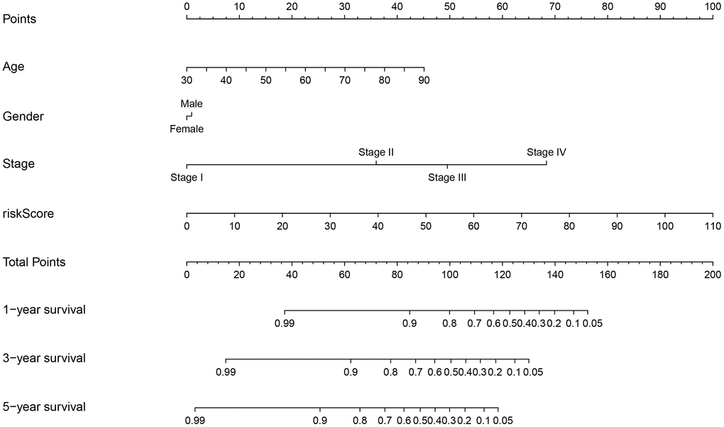 The correlations between the risk score model and traditional clinicopathological features were assessed using the chi-squared test and presented as a heatmap. The risk score differences among different groups of these clinicopathological features were calculated using the Wilcoxon signed-rank test and visualized using box diagrams. The p value was labeled as follows: P<0.001 = ***, P<0.01 = ** *, and P<0.05 = *. The multivariate logistic model, including the risk score model and clinicopathological characteristics, was used to develop a nomogram to predict the survival probability of COAD patients. The 1-, 3-, and 5-year OS rates were used as the endpoints in the nomogram.