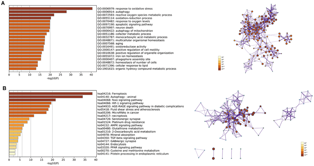 We identified 142 DEfrgenes in COAD tissues (Supplementary Table 8). Based on these genes, we explored the underlying biological functions by GO annotation and KEGG pathway analyses using Metascape. In this study, GO pathway and process enrichment analysis included molecular functions (functional set), biological processes (pathway), and cellular components (structural complex). The top 20 clusters with their representative enriched terms are shown in Figure 6A. Our results showed that biological processes related to oxygen metabolism were significantly associated with differentially expressed ferroptosis-related genes, including GO:0006979 (response to oxidative stress), GO:0072593 (reactive oxygen species metabolic process), GO:0055114 (oxidation-reduction process), GO:0070482 (response to oxygen levels), GO:0016491 (oxidoreductase activity), and GO:1901615 (organic hydroxy compound metabolic process). In addition, autophagy-related biological processes, such as GO:0006914 (autophagy), GO:0000422 (autophagy of mitochondria), GO:0055072 (iron ion homeostasis), and GO:0000407 (phagophore assembly site) were prominently related to differentially expressed ferroptosis-related genes. Moreover, DEfrGenes in COAD also dramatically affected GO:0097190 (apoptotic signaling pathway), GO:0070997 (neuron death), and several metabolism-related biological processes.