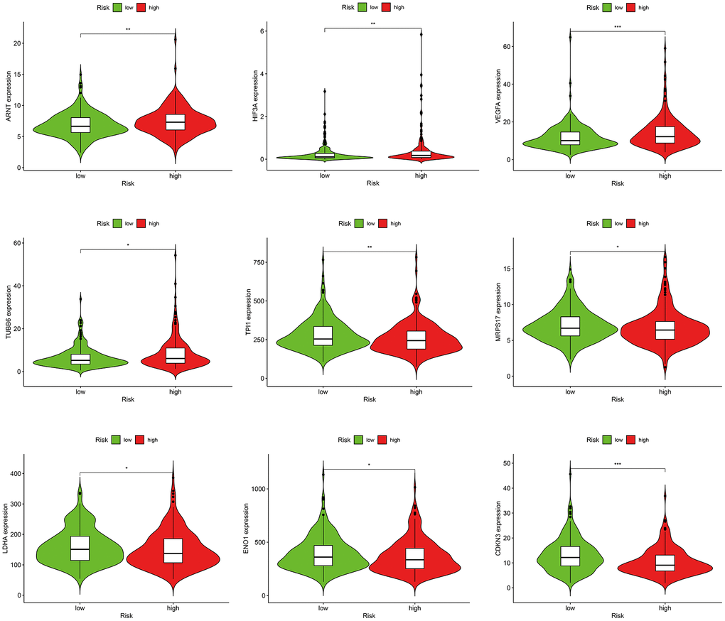 For the hypoxia and oxygen metabolism processes, as indicated by both the GO and KEGG analyses, we further explored the relationship between the risk score model and hypoxia-inducible factors and hypoxia-related genes. The results revealed that the high-risk group exhibited a significant correlation with high expression of ARNT, HIF3A, VEGFA, TUBB6 and low expression of TPI1, MRPS17, LDHA, ENO1, and CDKN3. Studies have demonstrated that high levels of HIF-1/2α proteins are associated with increased radiotherapy and chemotherapy resistance, resulting in cancer progression [40, 41]. In addition to inducing hypoxia, the HIF signaling pathway also participates in various bioregulatory processes, including ROS, cytokines, growth factors, oncogene dysfunction, and tumor suppressors, providing insights into the targeting of the HIF signaling pathway as a potential therapeutic approach in cancer management [42]. Studies have reported that hypoxia can promote disease development and metastasis by activating the HIF1α/VEGFA pathway in breast and colorectal cancer [43, 44]. Liang and colleagues found that hypoxia activated the HIF1α/VEGFA axis in breast cancer angiogenesis by inducing miR-153 expression and decreased expression of HIF1α and VEGFA, resulting in suppression of tumor angiogenesis. Chen et al. demonstrated that hypoxia could induce angiogenesis in colorectal cancer by activating the HIF-1α/VEGF-A pathway. LDHA and ENO1 are crucial glycolytic enzymes, which have been revealed as hypoxia-related factors in previous studies. Wei et al. found that inhibition of LDHA-mediated aerobic glycolysis could markedly suppress the growth of bladder cancer cells [45]. Cui et al. reported that HIF1/2α could activate LDHA expression, and high expression of LDHA promotes the growth and migration of pancreatic cancer cells [46]. Nevertheless, Wang et al. reported that high LDHA expression was associated with better PFS (18.3 vs. 10.1 months, P=0.005) and overall response rate (72.2% vs. 15.4%, P=0.006) of metastatic colorectal cancer patients receiving first-line chemotherapy [47]. Wang et al. discovered the role of ENO1 in hypoxia-induced gemcitabine chemoresistance, decreased expression of which restored sensitivity to chemotherapy by modulating redox homeostasis in pancreatic cancer cells [48]. However, our results showed lower expression of LDHA and ENO1 in the high-risk score group, which suggests some unknown underlying signal regulation mechanisms, which are worth further exploration.