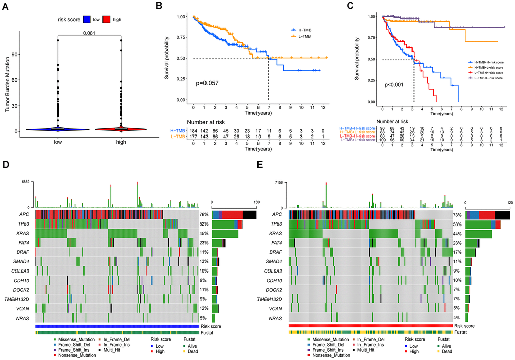 Studies have shown that cancers harboring more non-synonymous variants, which were defined as high tumor mutation burden (TMB), were associated with favorable survival outcomes with cancer immunotherapy. Given the prognostic value of TMB, we sought to investigate the relationship between the risk score model and TMB level. As shown in Figure 9A, there was no significant difference in TMB levels between the high- and low-risk groups. Furthermore, our study found no significant correlation between TMB and prognosis in patients with COAD (Figure 9B). Next, we evaluated the predictive power of the risk score model in the low and high TMB subgroups. The results revealed that the prognostic model presented consistent predictive value in both the low and high TMB subgroups, indicating that the TMB status did not interfere with the prediction of this model (Figure 9C). Moreover, our study explored the mutation rates of reported prognostic-related genes in low-and high-risk groups. Analysis results demonstrated that APC, SMAD4, DOCK2, TMEM132D, and VCAN genes had more frequent mutations in the low-risk group, whereas TP53 and BRAF mutations were more frequent in the high-risk group (Figure 9D, 9E).