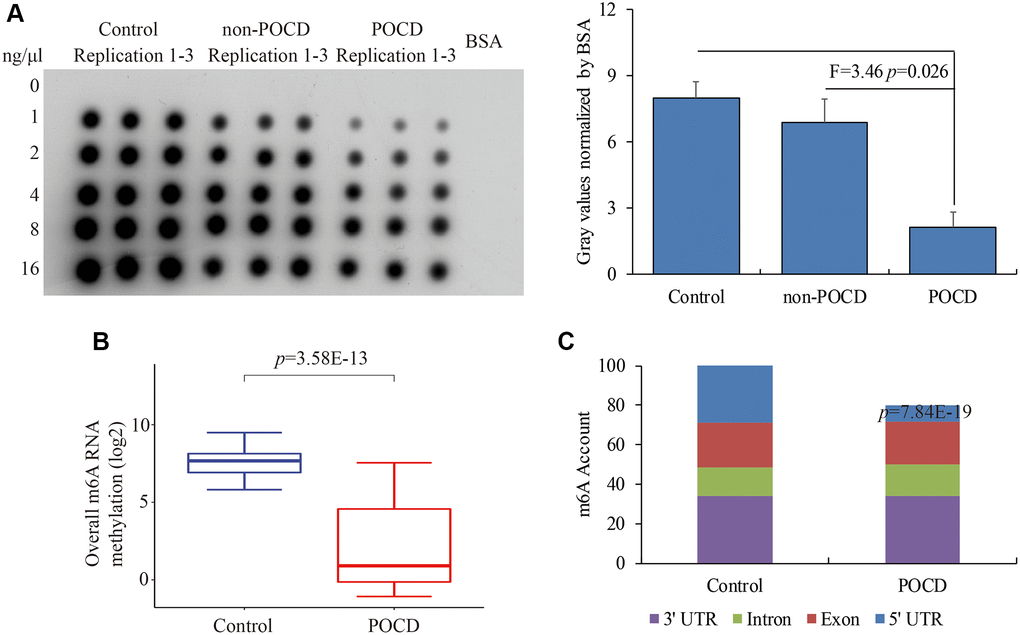 The reduced total m6A RNA methylation in a POCD hippocampus