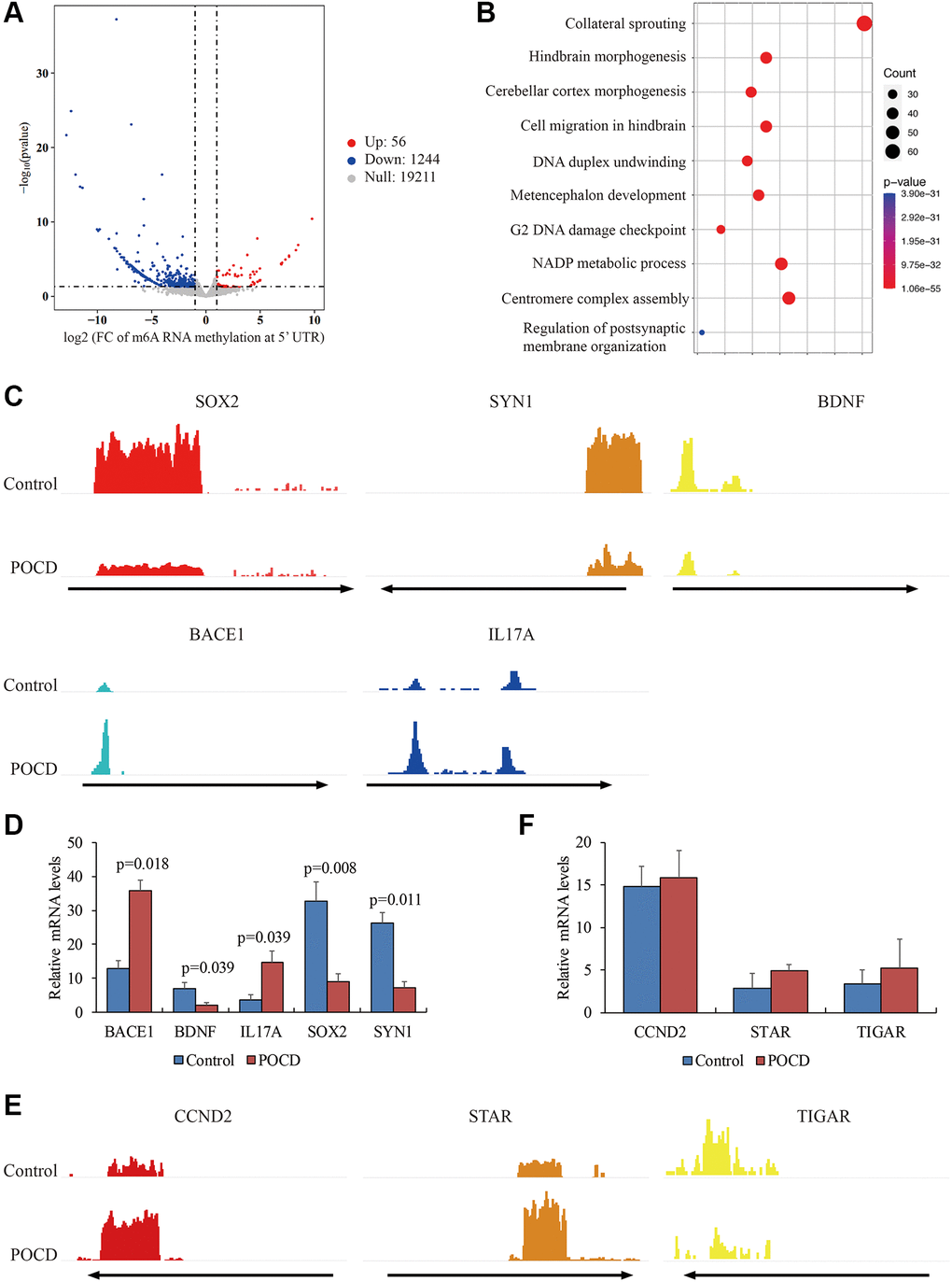 Next, we observed that m6A RNA methylation was significantly reduced in 1,244 genes and elevated only in 56 genes in POCD mice compared with the controls (Figure 2A). These genes were involved in central nervous system development and the DNA damage response, NADP (Figure 2B), containing BACE1, BDNF, IL17A, SOX2, and SYN1 (Figure 2C). Transcription of these genes was also validated by qPCR. It was noteworthy that the genes with robustly enriched m6A RNA methylation at the 5′UTR were all highly expressed, while genes with infrequent m6A RNA methylation at the 5′UTR were transcriptionally repressed (Figure 2D). Nevertheless, we failed to find any significant differences in the mRNA levels of CCND2, STAR, and TIGAR, which had differential m6A RNA methylation at the 3′UTR (Figure 2E and 2F). Taken together, we determined that abnormal m6A RNA methylation at the 5′UTR might contribute to transcription profiling in POCD.