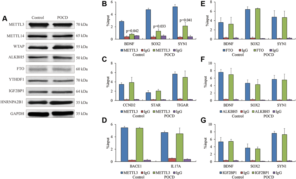 Next, we investigated the role of enzymes regulating m6A RNA methylation at the 5′UTR in POCD. Expressions of METTL3, METTL14, WTAP, FTO, ALKBH5, YTHDF1, IGF2BP1, and HNRNPA2B1 showed no significant differences between the POCD mice and the controls (Figure 3A). However, the affinity of METTL3 for target genes BDNF, SOX2, and SYN1 with reduced m6A RNA methylation at the 5′UTR was compromised in the POCD mice compared with the controls (Figure 3B). In turn, it was strange that enrichments of METTL3 on genes BACE1 and IL17A with elevated m6A RNA methylation at the 5′UTR in the POCD mice did not change compared with the controls (Figure 3C). Additionally, the interaction of METTL3 on genes CCND2, STAR, and TIGAR with the 3′UTR did not change in the POCD mice compared with the controls (Figure 3D). We also examined the binding ability of the three enzymes FTO, ALKBH5, and IGF2BP1 for regulating m6A RNA methylation on BDNF, SOX2, and SYN1 by RIP-qPCR, and we failed to find any differences in the 5′UTR (Figure 3E–3G). Collectively, the weakened METTL3 affinity was likely to contribute to the reduction of m6A RNA methylation at the 5′UTR of RNAs in POCD.