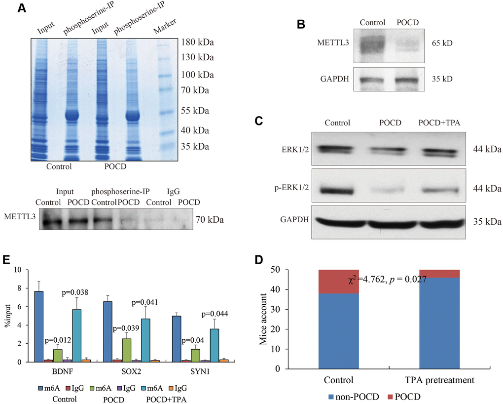Finally, we attempted to bridge the inactivated METTL3 and sevoflurane-induced POCD. Previous studies revealed that the serine phosphorylation of METTL3 played a crucial role in METTL3’s activity and was dependent on the MAPK/ERK signaling pathway [14]. To this end, IP experiments were conducted to capture phosphoserine, and reduced phosphorylated METTL3 was observed in the POCD models’ hippocampuses (Figure 4A). Due to the lack of a commercial phosphorylated METTL3 antibody, we indirectly found less bands of METTL3 over 65 kD in the POCD models’ hippocampuses using a regular METTL3 antibody by WB (Figure 4B), which indicated a potential reduced protein modification affected by sevoflurane. Moreover, the ERK activator TPA was used to treat the other three POCD mice by intracerebroventricular injection. The activity of the MAPK/ERK signaling pathway in hippocampal neurons was abrogated in the POCD mice compared with the controls and rescued by TPA (Figure 4C), suggesting that sevoflurane affected METTL3’s activity through MAPK/ERK inhibition. Expectedly, the target genes BDNF, SOX2, and SYN1 were observed to have highly enriched m6A RNA methylation at their 5′UTR after TPA treatment compared with the POCD mice (Figure 4D).