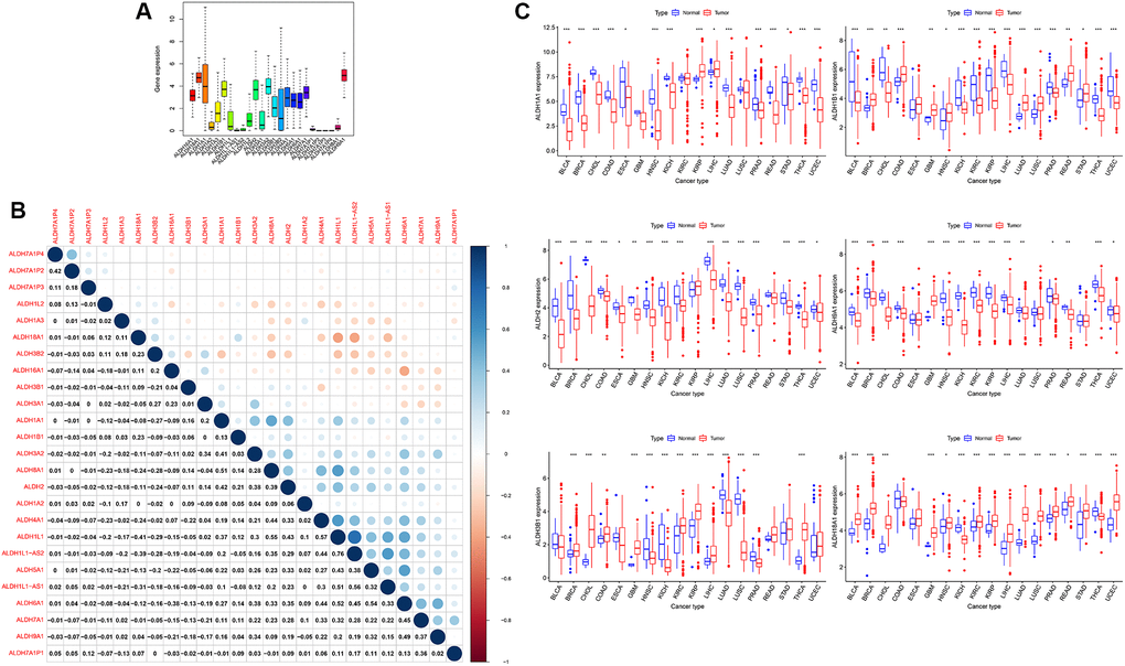 Through the TCGA database, the expression data of all ALDH families in all cancers were obtained. As shown in Figure 1, the expression genes of the ALDH family genes in cancer were very different (Figure 1A), and the expressions of the ALDH family genes were highly correlated (Figure 1B). In detail, ALDH9H1, ALDH18A1, ALDH3A2, ALDH1A1, ALDH1B1 and ALDH2 were expressed higher than other ALDH family genes in all cancers. The expression of ALDH2 and ALDH8A1 was highly positively correlated. The first six ALDH family genes were highly expressed in cancer was further analysis. According to the classification of normal tissues and tumor tissues, it was found that the expression of ALDH3B1, ALDH18A1, etc., increased in a variety of cancers, but ALDH9A1 and ALDH2 showed the opposite trend (Figure 1C) in UCEC. Except for ALDH3B1, which was statistically significant, the expression of the other 5 ALDH family members decreased in tumor tissues. Taken together, our data showed that the expression of ALDH was altered in a variety of cancers compared with normal tissues.