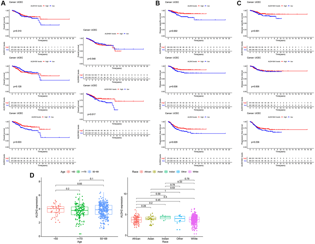To further confirm the effect of ALDH family genes that were highly expressed in cancer on UCEC patients, we retrieved the survival information of each patient in the TCGA database, combined with the expression analysis of ALDH family genes. Changes in other ALDH family genes did not affect the overall survival of UCEC patients. Kaplan-Meier analysis results showed that only the expression level of ALDH2 and ALDH18A1 mRNA had a significant impact on the OS of UCEC patients (P = 0.003 to ALDH2, P = 0.017 to ALDH18A1). Compared with the low expression group, the overall survival time of UCEC patients in the high expression group was significantly prolonged in the lower expression group (Figure 2A). At the same time, the survival of DSS, DFI, and PFI of the low expression group of ALDH2 was the same as the overall survival result, all of which showed a worse survival rate (Figure 2B). For DSS in the ALDH18A1 low expression group, DFI and PFI were not different from the high expression group (Figure 2C). These results indicated that patients in the ALDH2 low expression group were associated with worse prognostic survival in different survival groups. In addition to survival time and survival status, TCGA data also contained complete clinical information of the patient. The results of the clinical analysis revealed that the expression of ALDH2 was not significantly correlated with the age and race of the patients (Figure 2D).