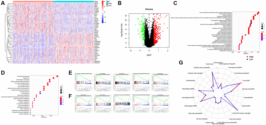 In this study, we downloaded the expression data of all UCEC samples in the TCGA database. The deletion was divided into 2 groups according to the median value and the expression of ALDH2, and the different genes between the groups were analyzed. A total of 477 differential genes were identified. Among them, 322 genes were up-regulated, and 155 genes were down-regulated (Figure 3A, 3B). The enrichment of GO and KEGG helps us understand the potential regulatory functions of these differential genes. The six pathways with the highest correlation found in GO enrichment are, humoral immune response mediated by circulating immunoglobulin, complement activation, classical pathway, complement activation, immunoglobulin mediated immune response, B cell-mediated immunity, and protein activation cascade (Figure 3C). The 6 pathways with the highest correlation of KGGE enrichment are, Cell adhesion molecules, Type I diabetes mellitus, Intestinal immune network for IgA production, Hematopoietic cell lineage, Th1 and Th2 cell differentiation, and Phagosome (Figure 3D). GSEA enrichment showed that the GO processes of the main ALDH2 up-regulated group included Azurophil Granule Lumen, Response to Interferon Gamma, Myeloid Leukocyte Migration, Mmune Receptor Activity, Tetrapyrrole Metabolic Process (Figure 3E). The GO processes of the down-regulation group included Mitochondrial Genome Maintenance, Regulation of DNA Recombination, Cell Cycle Checkpoint, DNA Replication Checkpoint, Sulfur Amino Acid Biosynthetic Process (Figure 3F). The above enrichment results indicated that the alteration of ALDH2 expression might be related to cellular immunity. Therefore, the immune infiltration score of each UCEC patient was calculated by R software with CIBERSORT package. The results showed that patients in the ALDH2 low expression group had lower scores for CD8+ T cells and plasma cells (Figure 3G).