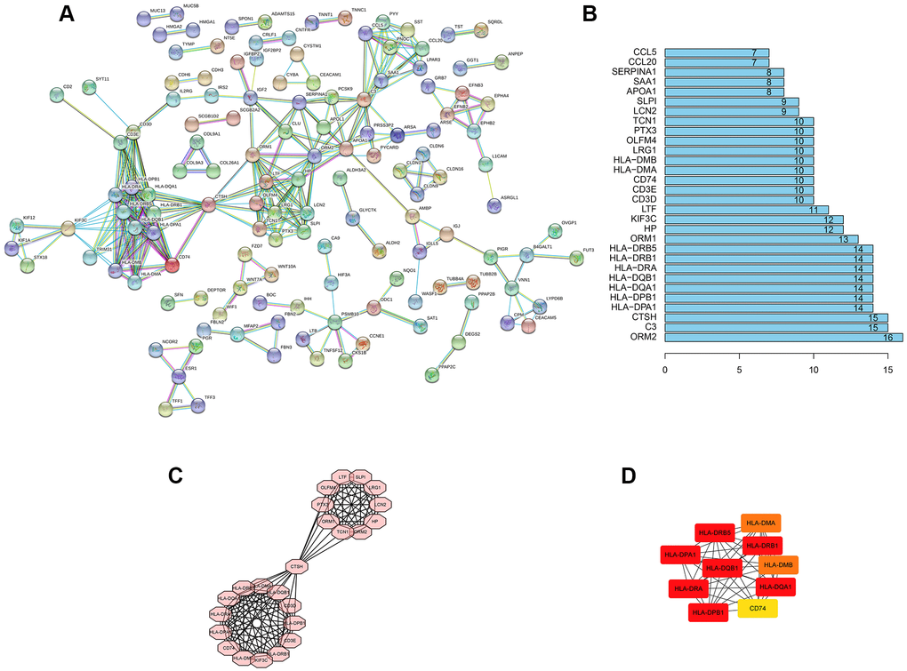 PPI of DEGs was constructed by using the String network tool. After hiding all the individual nodes, it was found that there were 392 nodes and 295 edges (Figure 4A). Statistics showed that the first six genes with the number of interaction relationships were ORM2, C3, CTSH, HLA-DPA1, HLA-DPB1 and HLA-DQA1 (Figure 4B). At the same time, the MCODE app was used to analyze the most significant interaction modules. The module network consisted of 24 nodes (Figure 4C). In addition, the hub node was calculated through cytoHubba app (Figure 4D). These genes had a potential relationship with ALDH2. It played the role of an oncogene in the occurrence and development of UCEC, which was related to the occurrence, development and prognosis of UCEC.