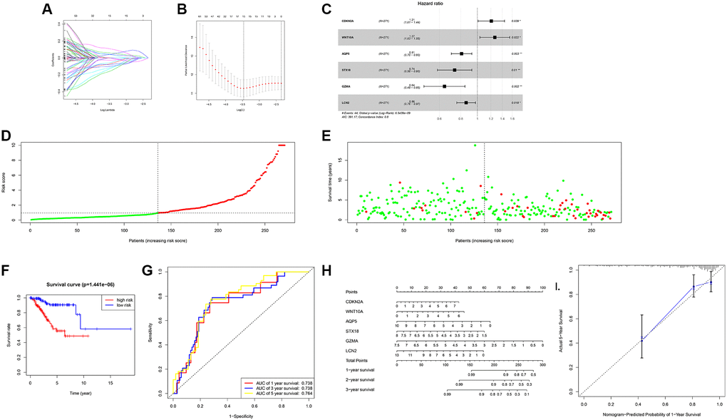 Our data showed that the high expression ALDH2 group had a better OS, DSS, and PFI (Figure 2). Therefore, a prognostic model based on the overall survival score of ALDH2 expression was constructed. The expression profile of UCEC in the TCGA database was randomly divided into an equal number of training groups and test groups. COX univariate results revealed that a total of 62 genes were significantly related to the overall survival of UCEC patients. Further use lasso regression to screen out 15 genes to prevent the model from overfitting (Figure 5A, 5B). Finally, a 6-factor overall prognostic risk score model was established using COX stepwise regression. The coefficient of risk score model of overall survival was: CDKN2A × 0.18793 + WNT10A × 0.23536 + AQP5 × (−0.21242) + STX18 × (−0.30617) + GZMA × (−0.44271) + LCN2 × (−0.15148). COX multifactorial analysis found that they were all highly significantly related to prognosis (Figure 5C).