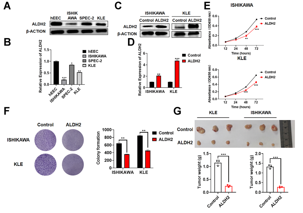 To determine whether ALDH2 expression was reduced in EC cell lines, it was detected by Western Blot and qRT-PCR. Compared with normal human endometrial epithelial cells hEEC, the expression of ALDH2 was lower in ISHIKAWA, SPEC-2, and KLE (Figure 6A, 6B). In the meantime, a lentiviral plasmid pLKO.1-ALDH2 was constructed to overexpressed ALDH2. The overexpression efficiency was verified by Western Blot and qRT-PCR (Figure 6C, 6D). Next, the relationship between the expression of ALDH2 and the proliferation ability of EC was verified by CCK-8 and colony formation analysis (Figure 6E, 6F). The results showed that restoring the overexpression of ALDH2 reduced the proliferation ability of EC cell lines. Subsequently, a subcutaneous tumor model was used to assess the ability of tumor genesis and growth. As shown in Figure 6G, the tumors in overexpression of the ALDH2 group were significantly smaller than those of the control group (Figure 6G).