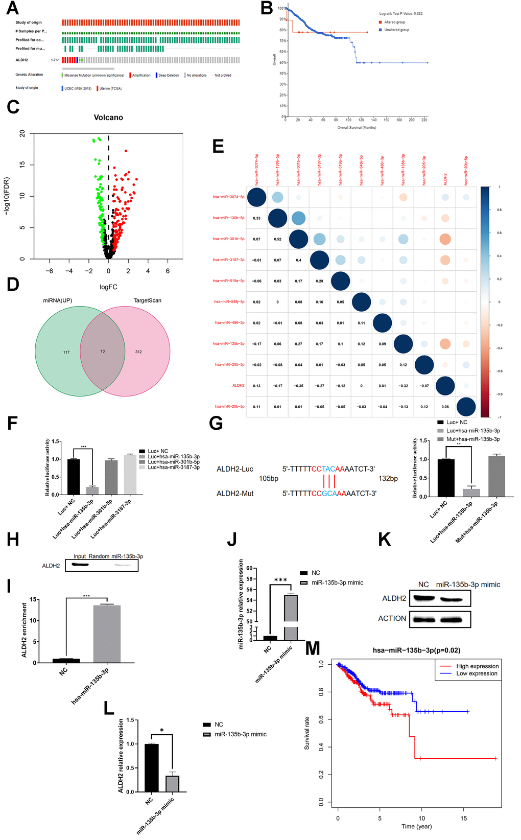 Numerous studies had proved that miRNA could silence gene expression by targeting gene 3′UTR, consequently, it was speculated that ALDH2 might also be regulated by this mechanism. By screening the difference in miRNA between UCEC patients and the normal group, the volcano plot showed that a total of 122 up-regulated miRNAs were screened (Figure 7C). At the same time, the bioinformatics prediction website TargetScan was also visited. As a result, 312 miRNAs were predicted to bind to ALDH2’s 3′UTR. A total of 10 miRNAs were selected from the intersection, and the correlation between their expression and ALDH2 expression was shown in the figure (Figure 7D, 7E). The top three miRNAs with the highest negative correlation were hsa-miR-301b-5p, hsa-miR-3187-3p and hsa-miR-135b-3p.