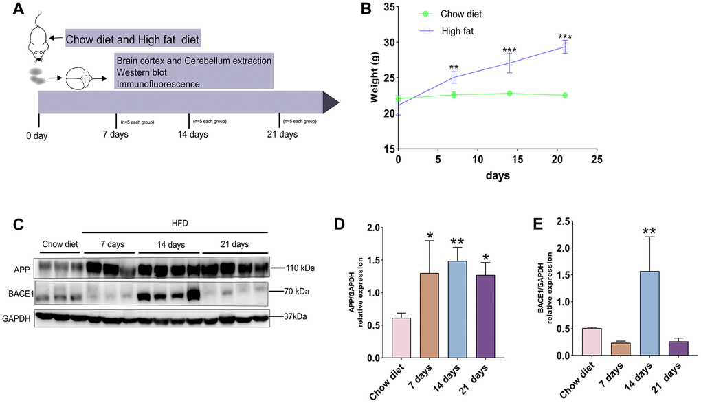 Effects of short-term HFD on total body weight, expression of amyloid precursor protein (APP) and BACE1 in a mouse model at two months of age