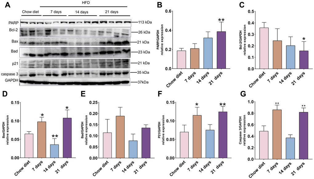 As demonstrated in Figure 2A, the PARP protein level was significantly enhanced at day 21 compared to chow diet groups (p < 0.01) (Figure 2B). In contrast to PARP expression, the anti-apoptotic BCL-2 protein showed opposite trend and significantly reduced after 21 days HFD compared to chow diet mice (p < 0.05) (Figure 2C). The pro-apoptotic Bax was raised at day 7 and 21 and reduced at day 14 compared to chow diet groups (p < 0.05; p < 0.01) (Figure 2D). Intriguingly, no significant difference changes were found for pro-apoptotic Bad at different time-points (Figure 2E). Furthermore, cerebral cortex senescence was significantly induced at day 7 and 21 compared to chow diet (p < 0.05; p < 0.01) (Figure 2F) and confirmed by p21, which invokes cell cycle arrest and senescence [28]. On the other hand, caspase-3 protein exhibited similar results as the p21 protein expression (p < 0.01) (Figure 2G). Taken together, these findings indicate that short-term consumption of a HFD not only accelerates cell death through apoptosis but also advances senescence in cerebral cortex.