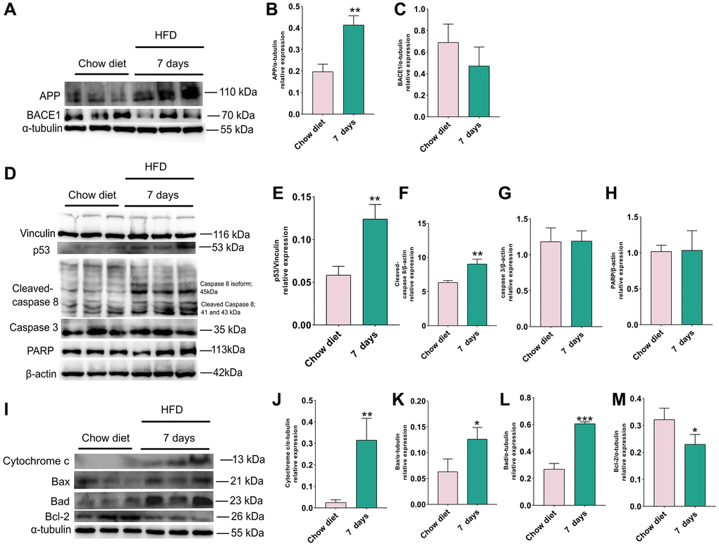 Changes of APP, BACE1, apoptosis proteins in cerebellum after 7 days HFD