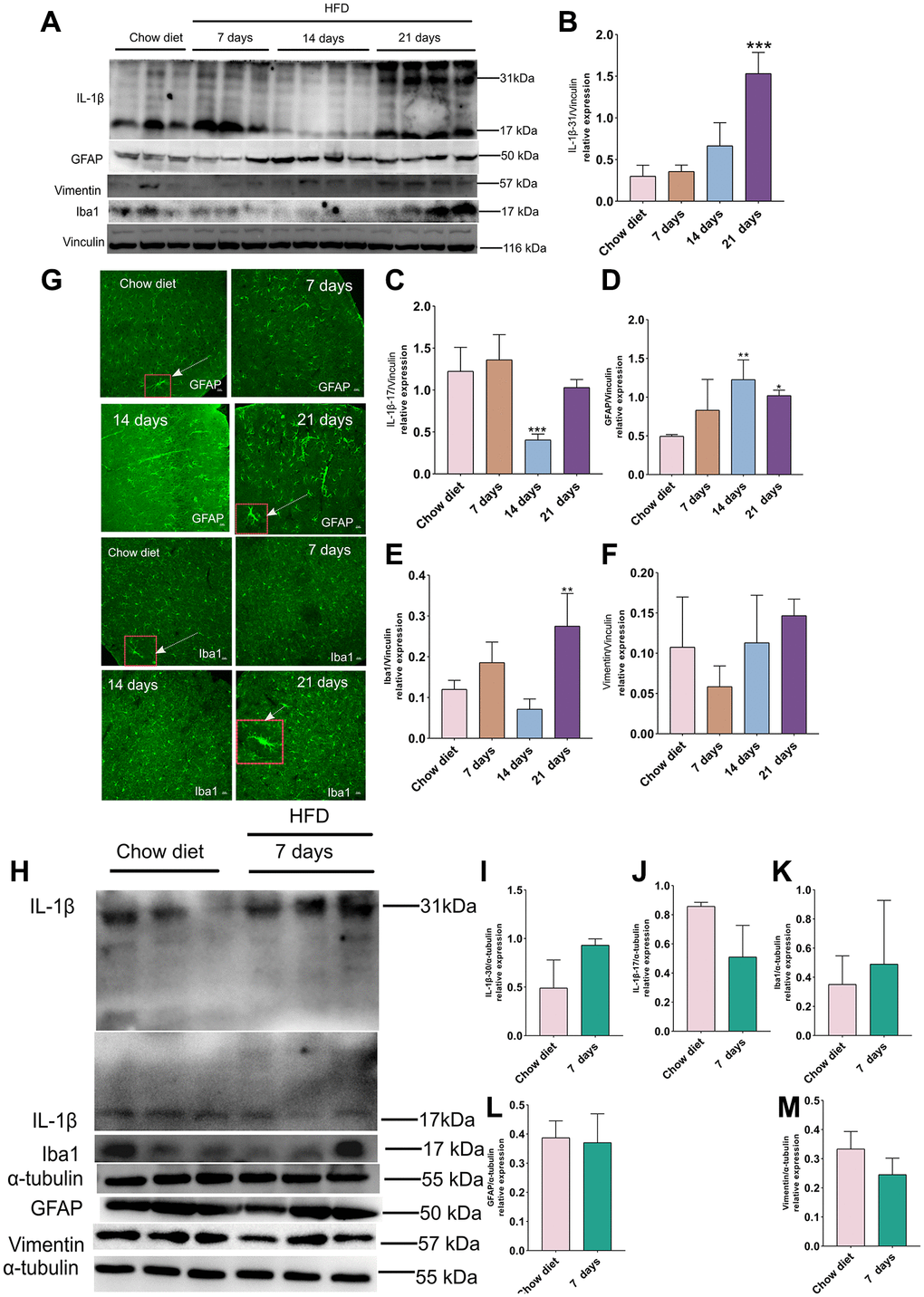 To investigate whether short-term HFD could activate pro-inflammatory actions and glial activation, western blotting and IF staining were conducted with IL-1β (a key player in the regulation of inflammatory processes) [29], Iba-1 (ionized calcium binding adapter protein 1; a hallmark of microglial activity) [30] as well as GFAP and vimentin antibody. As illustrated in Figure 4A, the expression of IL-1β 30 were increased considerably at day 30 compared to chow diet (p < 0.001) (Figure 4A–4B) in cerebral cortex. In the meantime, IL-1β 17 remained unchanged after 21 days HFD and showed a decrease at day 14 in these regions (p < 0.001) (Figure 4C). On the other hand, the level of GFAP and Iba-1 exhibited evidently higher than chow diet (p < 0.05; p < 0.01) (Figure 4D–4E). However, vimentin did not display obviously difference at various time course (Figure 4D–4F). Moreover, the IF staining results in Figure 4G also demonstrated hypertrophic astrocytes [31] and hypertrophic microglia [32] delineated by red boxes at day 21 compared to chow diet groups. In addition, consistent with the results from western blot analysis, Quantitation optical density of GFAP+ astrocytes (Supplementary Figure 1A) and Iba1+ microglia (Supplementary Figure 1B) staining was significantly enhanced at 21 days HFD compared with chow diet group (p < 0.01). Therefore, the results indicates that short-term HFD can promote neuroinflammation and glial cell activities in cerebral cortex. Moreover, no significant difference was found in IL-1β 30 and IL-1β 17 between chow diet and HFD mice in cerebellum (Figure 4H–4J). Contrary to cerebral cortex findings at day 21, no changes were observed in GFAP, vimentin and Iba-1 in 7 days HFD-fed mice compared to chow diet mice in cerebellum (Figure 4K–4M). These observations demonstrate that cerebellum may be resistant apoptosis occurrence within 7 days of eating HFD.