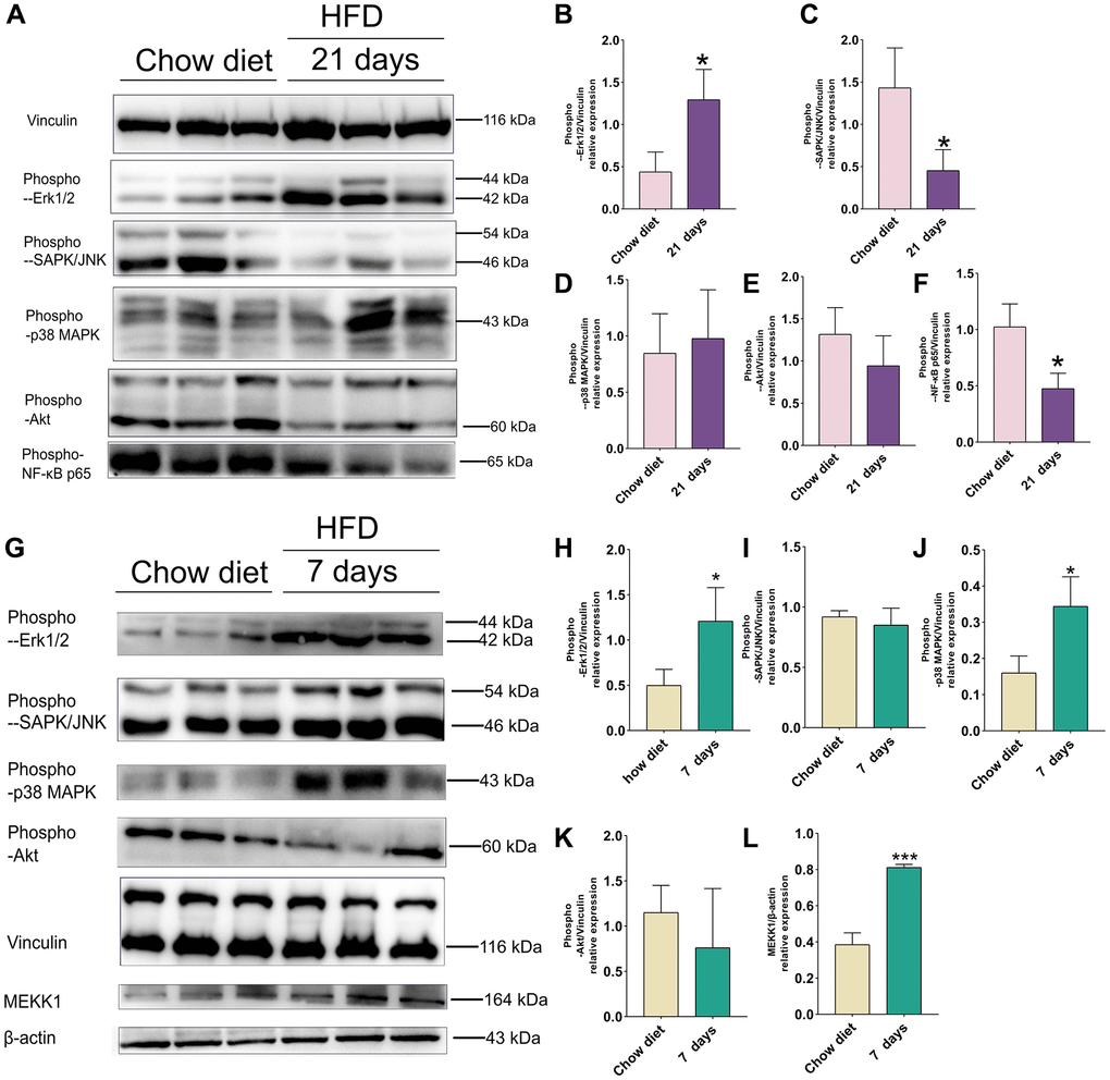 As illustrated in Figure 5G, western blot indicated that activities of phospho- ERK1/2, phospho-p38 MAPK and MEKK1 were increased significantly 1 weeks after HFD-fed mice in cerebellum (p < 0.05; p < 0.01) (Figure 5H, 5J, 5L). However, no significant results were found in phospho-JNK and phospho-Akt between chow diet and HFD mice (Figure 5I, 5K).