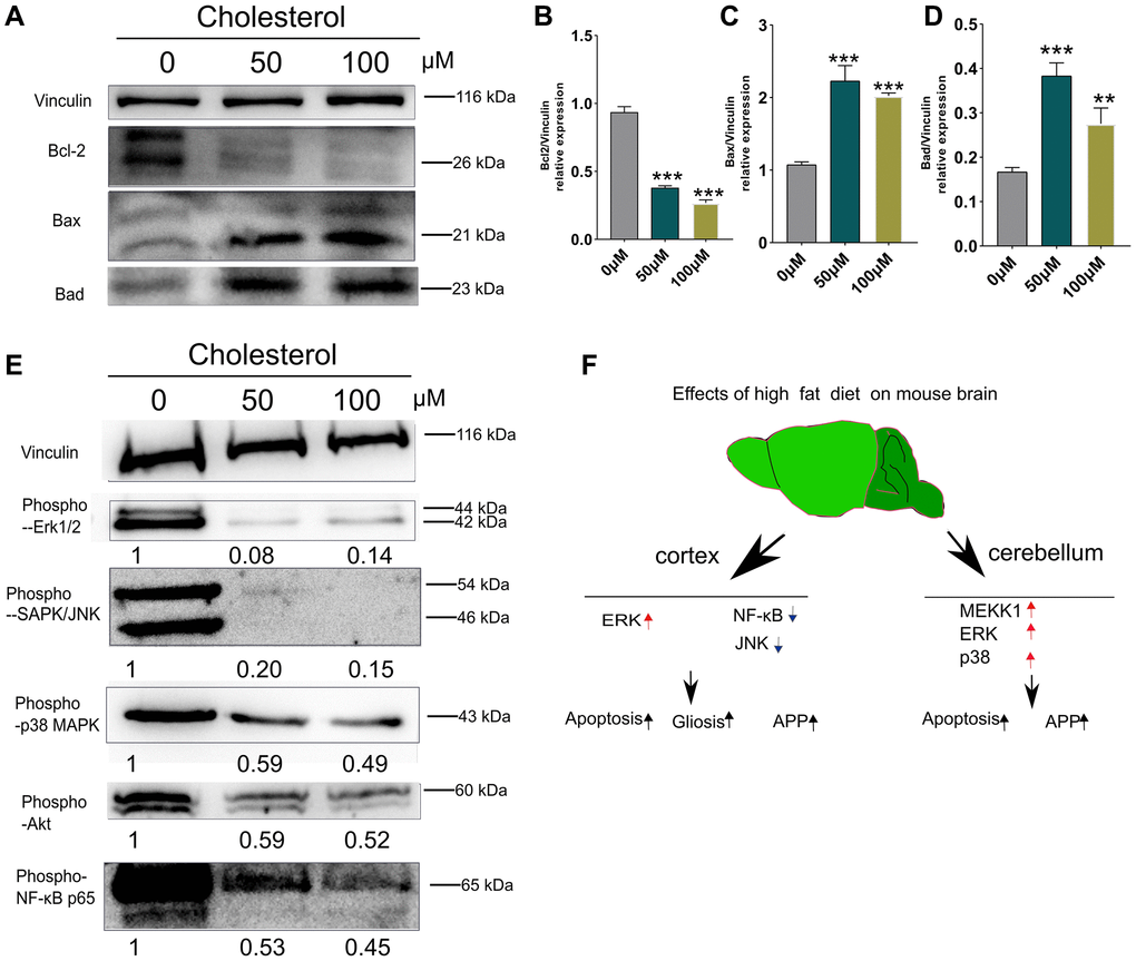 As shown in Figure 6A–6E, the stimulation of SH-SY5Y cells with 50 μM and 100 μM cholesterol [33] significantly decreased the level Bcl-2 in associated with evident increased Bax and Bad, compared with control group (0 μM) (p < 0.01; p < 0.001) (Figure 6B–6D). Interestingly, phospho-ERK1/2, phospho-JNK phospho-p38 MAPK and phospho-Akt were obviously reduced compared to control group (0 μM) (Figure 6E). Altogether, while cholesterol-treated cell models in vitro can partially simulate apoptosis in cortex and cerebellum of HFD-fed mice, these results do not represent the changes of stress signaling in vivo.