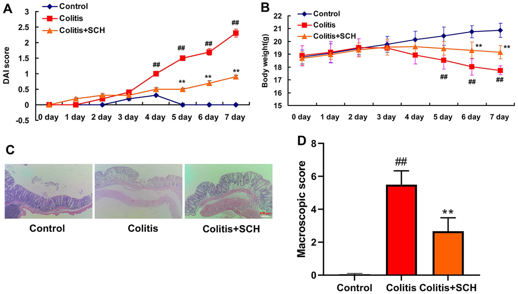 All experiments related to animal were approved by the Animal Care and Use Committee of Wannan Medical College. All C57BL/6 mice (5-6 weeks, 18-20 g) were obtained from Animal testing center of Qinglongshan (Nanjing, Suzhou, China). C57BL/6 mice were randomly assigned to three groups: sham group (n = 6), model group (n = 8), 10 mg/kg Schisandrin B (Sigma-Aldrich LLC.) treatment group (n = 8). All mice of model group were induced by giving 2.0% dextran sulfate sodium (DSS, MP) in the drinking water for 7 days. All mice of Schisandrin B were given with 10 mg/kg/ per day Schisandrin B body weight by intraperitoneal injection 1 h, and then induced by giving 2.0% dextran sulfate sodium (DSS, MP) in the drinking water for 7 days. Weight of every mice were measured at every day.