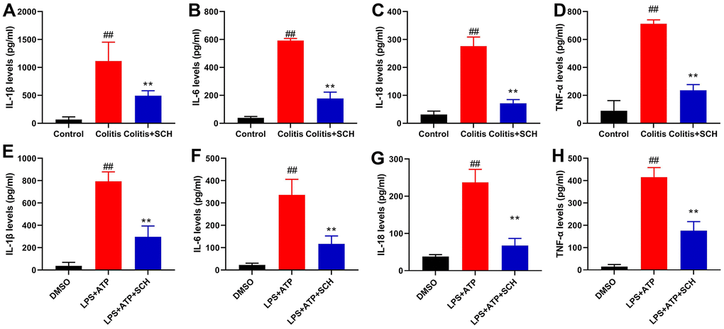 This study determined whether Schisandrin B reduced inflammation in vivo and vitro model of colitis. It was found that serum TNF-α, IL-6, IL-18 and IL-1β levels in DSS induced colitis mice model was significantly higher than those in the control normal group (Figure 2A–2D). Compared with the DSS induced colitis mice model group (Figure 2A–2D), administration of Schisandrin B more significantly reduced the serum TNF-α, IL-6, IL-18 and IL-1β levels in DSS induced colitis mice model. Apart from that, LPS+ATP induced the supernatant TNF-α, IL-6, IL-18 and IL-1β levels in intestinal epithelial cells (Figure 2E–2H). Schisandrin B reduced the supernatant TNF-α, IL-6, IL-18 and IL-1β levels in intestinal epithelial cells by LPS+ATP (Figure 2E–2H).