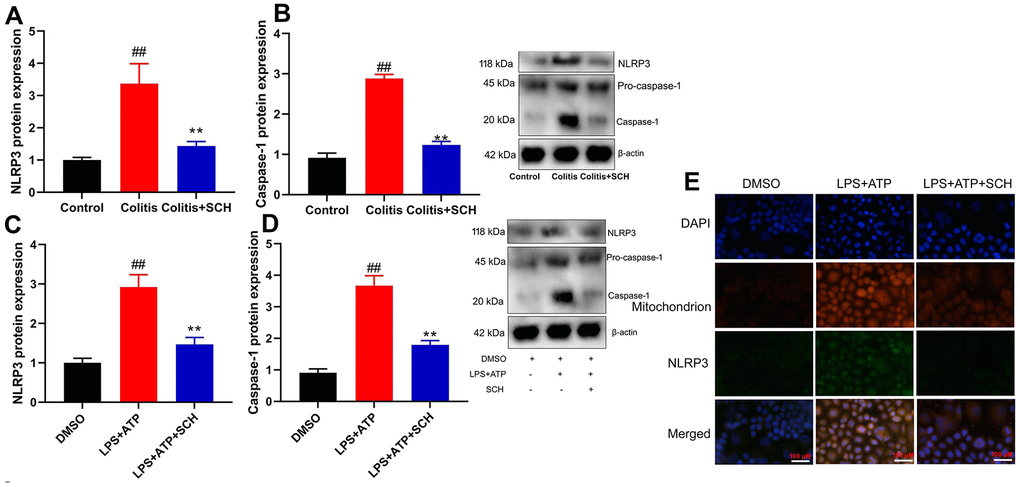 In order to determine the potential mechanisms by Schisandrin B in model of colitis, NLRP3 inflammasome had been previously defined as the key mediators in inflammation reactions in colitis. Furthermore, NLRP3 protein expression in colon tissue of DSS induced colitis mice model was induced (Figure 3A, 3B). On the one hand, administration of Schisandrin B suppressed NLRP3 protein expression in colon tissue of DSS induced colitis mice model (Figure 3A, 3B). On the other hand, LPS+ATP induced the NLRP3 protein expression in intestinal epithelial cells (Figure 3C, 3D). Schisandrin B reduced NLRP3 protein expression in intestinal epithelial cells by LPS+ATP (Figure 3C, 3D). According to immunofluorescence, LPS+ATP induced NLRP3 expression (green) and activated mitochondrial damage (red) in intestinal epithelial cells. Meanwhile, NLRP3 protein coincided with mitochondrial damage in intestinal epithelial cells (Figure 3E). Schisandrin B suppressed NLRP3 expression (green) and reduced mitochondrial damage (red) in intestinal epithelial cells by LPS+ATP (Figure 3E). These results suggest that Schisandrin B suppressed NLRP3 inflammasome in vivo and vitro model of colitis, which may be attributed to mitochondrial damage.