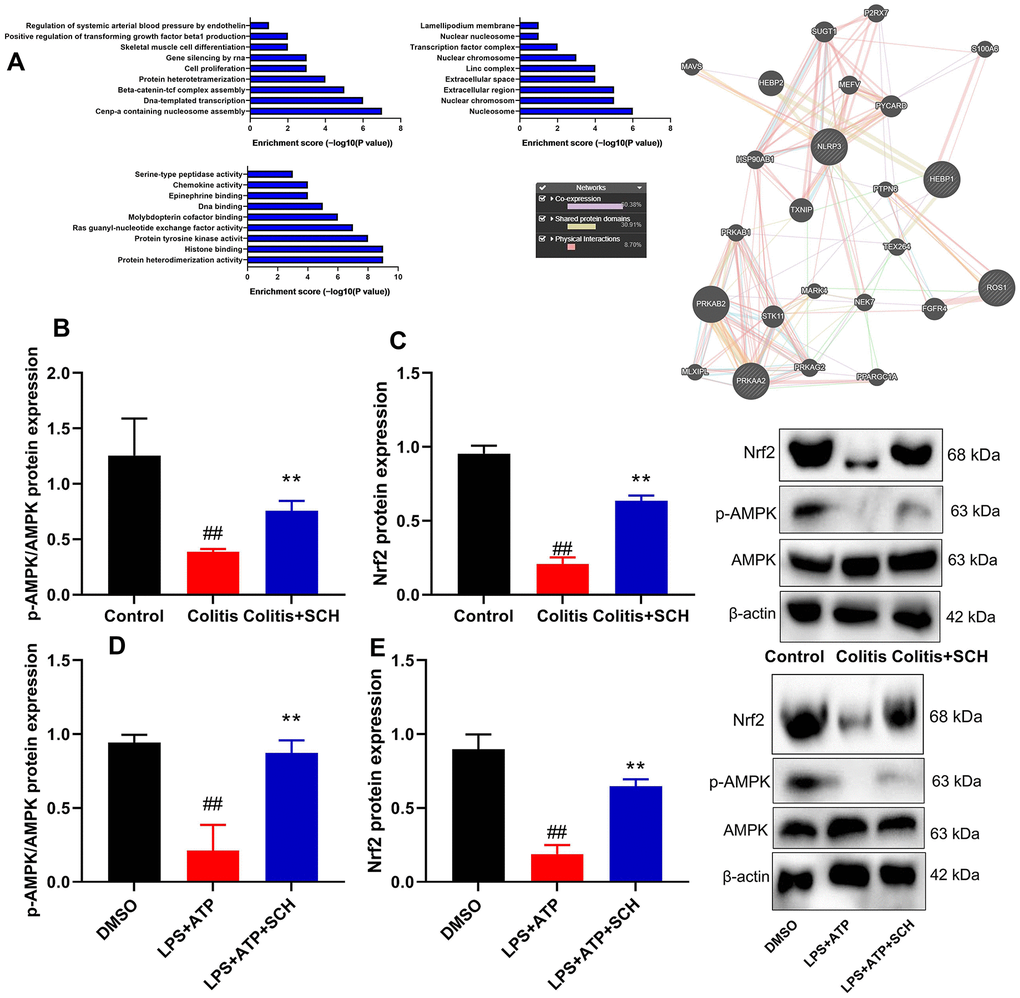 TCMSP server (http://ibts.hkbu.edu.hk/LSP/tcmsp.php) was used to further investigate the anti-inflammatory mechanism of Schisandrin B in DSS-induced acute colitis (see physical interactions, pathways and co-localisation in Figure 4A). Obviously, 60.38% showed similar co-expression characteristics, and 30.91% shared the same protein domain. Then, AMPK/Nrf2 signaling for target fishing and pathway was analyzed. Schisandrin B induced p-AMPK and Nrf2 protein expression in colon tissue and intestinal epithelial cells by LPS+ATP (Figure 4B–4E). As shown by these results, Schisandrin B suppressed NLRP3 inflammasome in intestinal epithelial cells by AMPK/Nrf2 signaling.