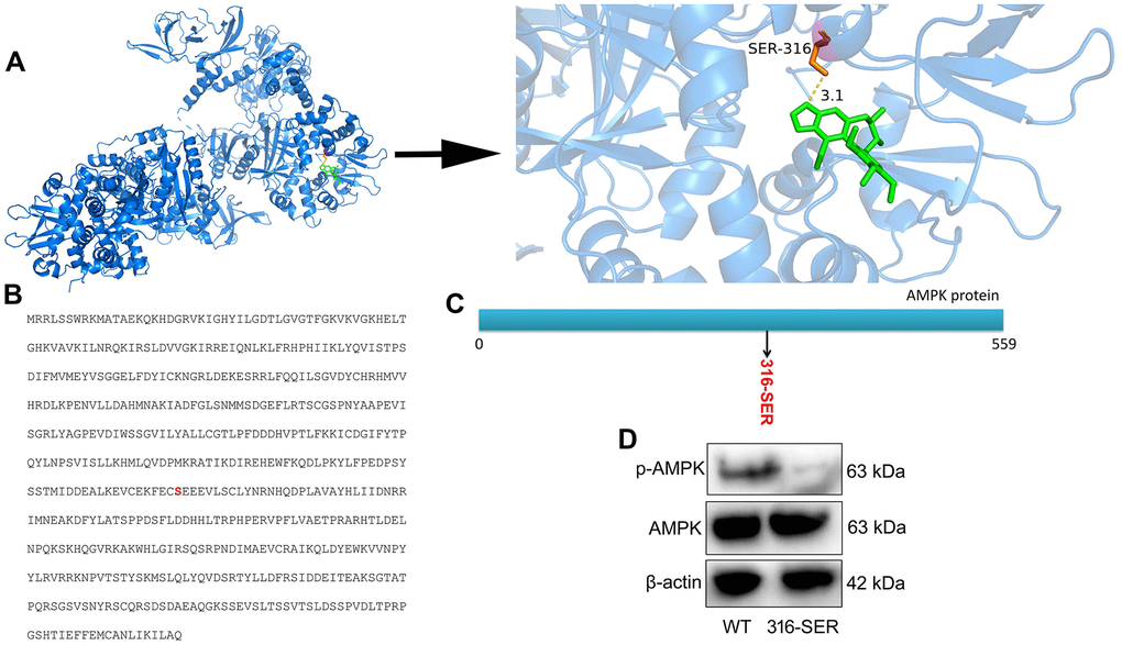 According to the degree value and frequency, AMPK corresponding to only one active component in network screening target was selected for molecular docking. Indeed, the binding energy of receptor and ligand is less than - 6.3 kcal / mol, so that it can be considered to have a strong binding activity. Beyond that, the docking results were imported into Python PyMOL 2.5.0 Open Source Software for final visualization and local optimization. The results are displayed in Figure 5A. Furthermore, we conducted protein structure modification and reformed at 316-SER (Serine) of AMPK protein (Figure 5B, 5C). Compared with WT protein expression, p-AMPK protein expression was more significantly suppressed in 316-mutant protein (Figure 5D). Taken together, these results revealed that Schisandrin B combined AMPK protein at 316-SER.