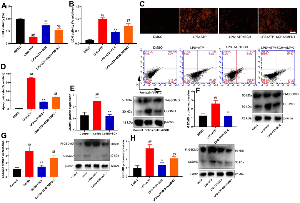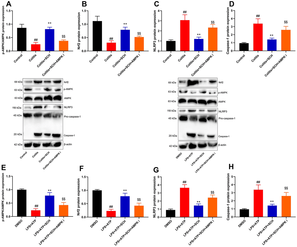 Colon tissue samples or cell samples or supernatant samples were split using RIPA assay (Beyotime) in ice. Total proteins were quantified using BCA assay (Beyotime) and were electrophoresed on 10% SDS-acrylamide gels. Total proteins were transferred to nitrocellulose membranes and membranes were blocked with 5% non-fat milk in TBS for 1 h at 37° C. Membranes were incubated with p-AMPK (ab23875, abcam), AMPK (ab32047, abcam), Nrf2 (ab62352, 1:1000, abcam), GSDMD (ab219800, 1:1000, abcam), NLRP3 (sc-66846, 1:500, Santa Cruz, USA), caspase-1 (sc-1780, 1:500, Santa Cruz, USA), and β-Actin (BS6007MH, 1:5000, Bioworld Technology, Inc.) at 4° C overnight. The membranes were incubated with horseradish peroxidase-conjugated secondary antibodies (sc-2004 or sc-2005, 1:5000, Santa Cruz, USA) for 1 h at 37° C after washing with TBST for 15 min. Protein was measured using an enhanced chemiluminescence system (ECL, Beyotime) and analyzed using an Image Lab 3.0 (Bio-Rad Laboratories, Inc.).