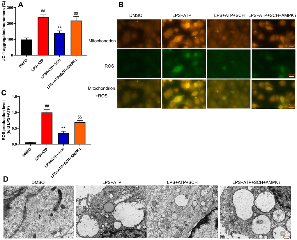 It is believed that ROS-induced mitochondrial damage is a common trigger of various NLRP3-activating agents. Thus, we analyzed whether Schisandrin B suppressed ROS-induced mitochondrial damage in intestinal epithelial cells by LPS+ATP. Obviously, LPS+ATP caused JC-1 aggregates and ROS production levels to increase in intestinal epithelial cells (Figure 7A, 7B). At the same time, Schisandrin B reduced JC-1 aggregates and ROS production levels in intestinal epithelial cells by LPS+ATP (Figure 8A, 8B). AMPK inhibitor (Dorsomorphin, 10 μM) increased JC-1 aggregates and ROS production levels in intestinal epithelial cells by LPS+ATP and Schisandrin B, in comparison to the group treated with Schisandrin B (Figure 7A, 7B). According to immunofluorescence, LPS+ATP enhanced ROS production level (green) and activated mitochondrial damage (red) in intestinal epithelial cells. ROS coincided with mitochondrial damage in intestinal epithelial cells (Figure 8C). In addition, Schisandrin B inhibited ROS production level (green) and reduced mitochondrial damage (red) in intestinal epithelial cells by LPS+ATP (Figure 8C). AMPK inhibitor (Dorsomorphin, 10 μM) promoted ROS production level (green) and mitochondrial damage (red) in intestinal epithelial cells by LPS+ATP and Schisandrin B, in comparison to the group treated with Schisandrin B (Figure 8C). More importantly, electron microscope indicated that LPS+ATP induced mitochondrial damage in intestinal epithelial cells (Figure 8D). Schisandrin B restored mitochondrial damage in intestinal epithelial cells by LPS+ATP (Figure 8D). AMPK inhibitor (Dorsomorphin, 10 μM) amplified mitochondrial damage in intestinal epithelial cells LPS+ATP and Schisandrin B, in comparison to the group treated with Schisandrin B (Figure 8D). Taken together, these results indicated that ROS-induced mitochondrial damage might be a dominant mechanism of underlying activation of the NLRP3 inflammasome in colitis by treatment with Schisandrin B through AMPK/Nrf2 signaling pathway.