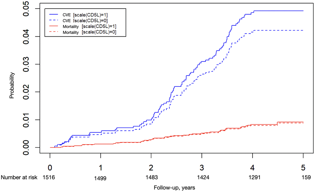 The Cox model revealed that the independent predictive variables for CV events were CD5L (HR, 1.19; 95% CI, 1.01–1.41), diabetes (HR, 1.72; 95% CI, 1.09–2.71), age (HR, 1.29; 95% CI, 0.99–1.68), smoking (HR, 2.03; 95% CI, 1.25–3.28) and dialysis (HR, 2.12; 95% CI, 1.17–3.84). Figure 1 shows that the probability of a CV event was higher with high CD5L concentrations but similar for all-cause mortality according to the Cox model adjusted with competitive risks.