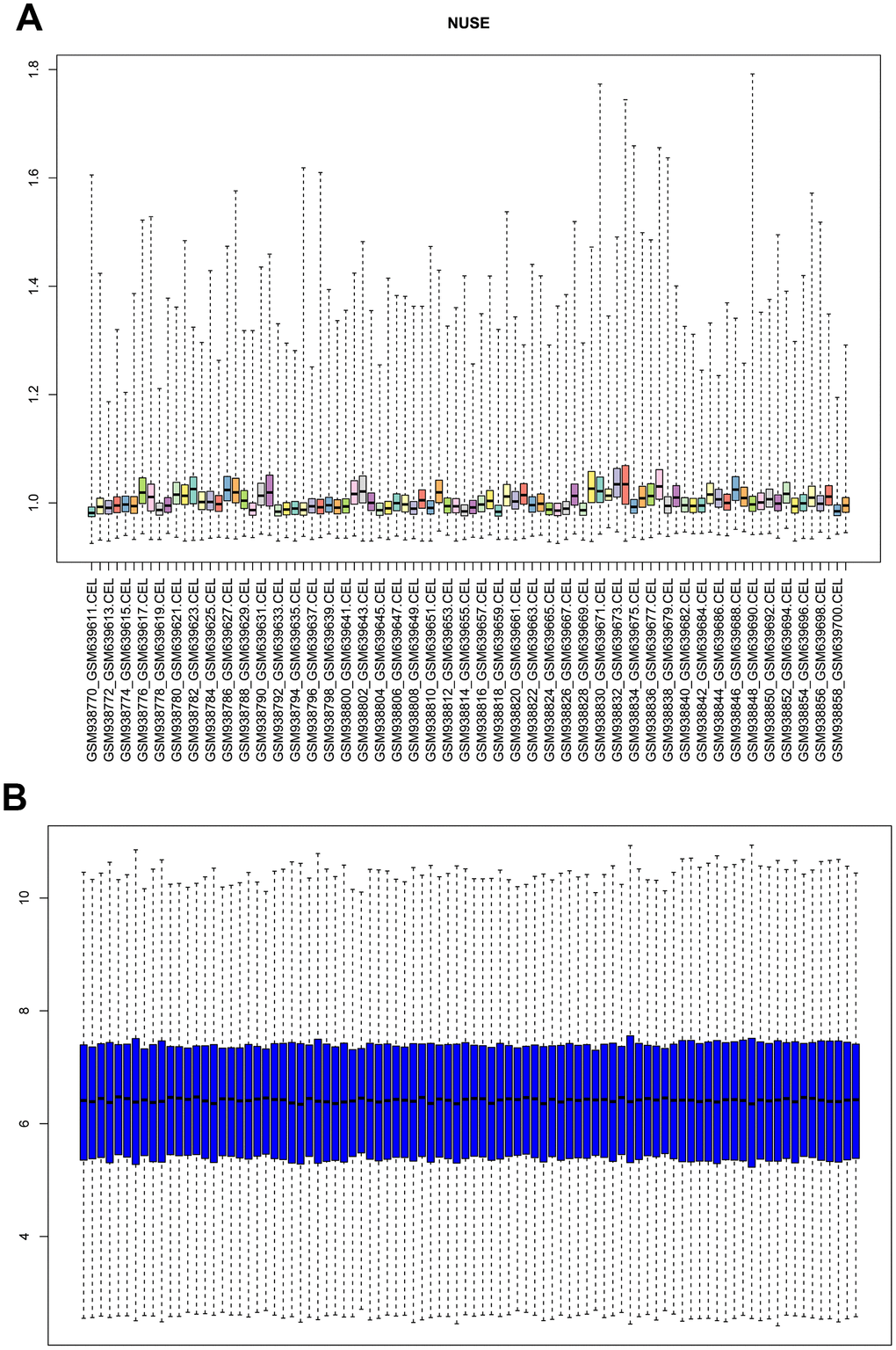 The microarray dataset GSE26049 was applied in this study, gene expression profiles of normal samples and different tumor samples (total n=90) were normalized and generated. Unqualified samples were eliminated according to the quality control of these gene chips, and standard samples were filtered by calculating the normalized unscaled standard errors (NUSE), NUSE plot was displayed for quality check (Figure 1A). Results illustrated that all these 90 samples had a good chip quality and could be used for further research. Then RMA algorithm was performed for data preprocessing, the boxplot of normalized and background corrected value was plotted (Figure 1B), results showed that the median amount of gene expression in each sample was on a straight line, indicating that the preprocessed data was served as standard data and could be analyzed in the following study.