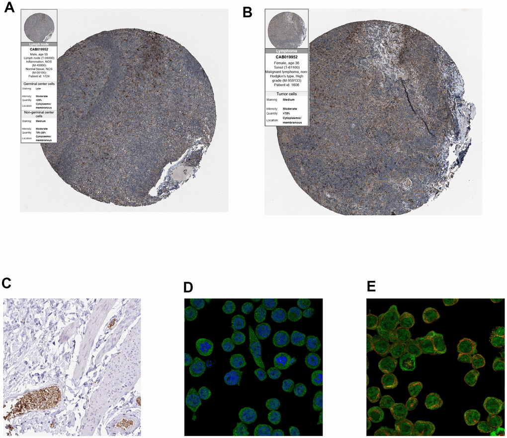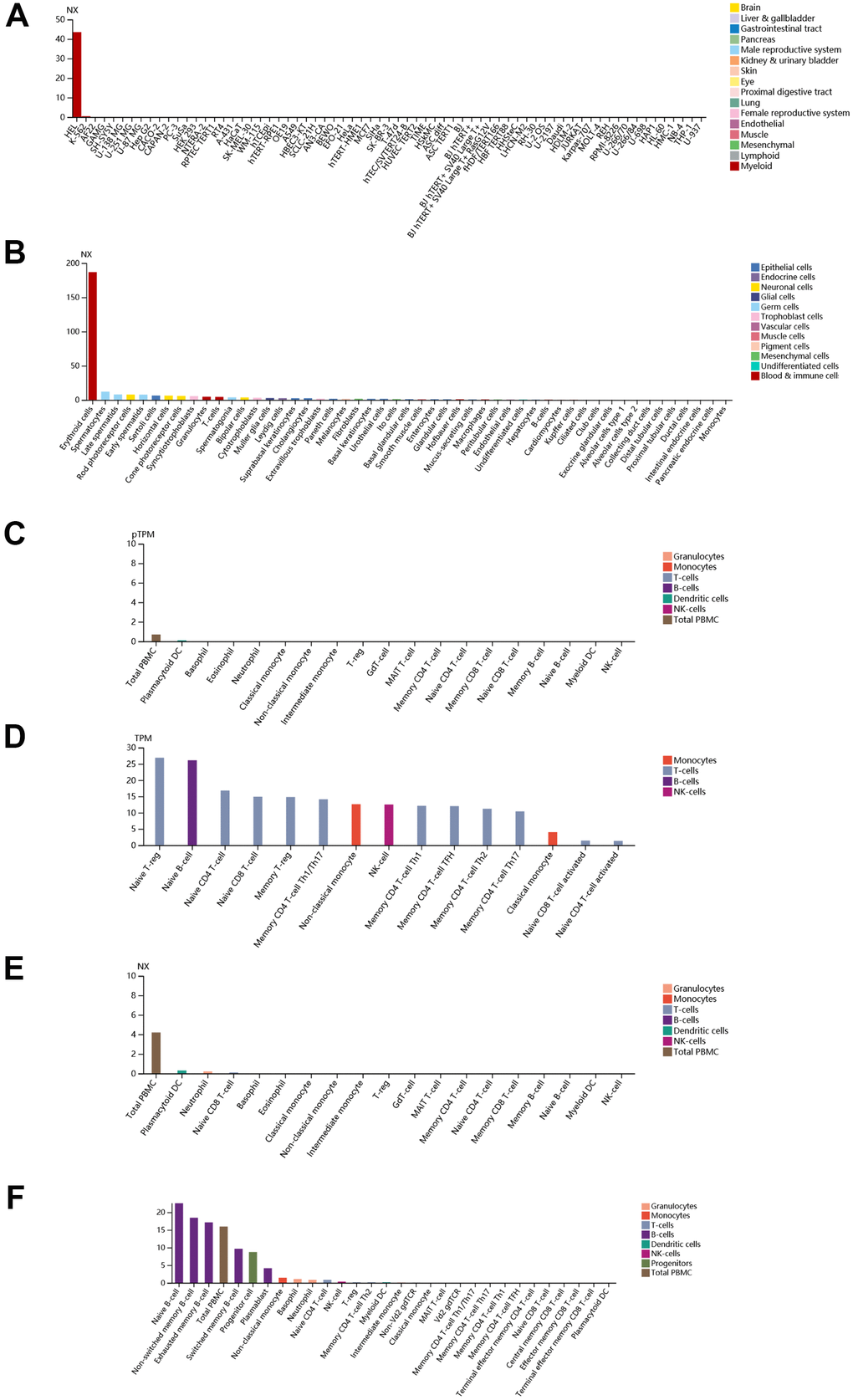 Finally, immunohistochemistry (IHC) as well as immunofluorescence (IF) were performed to detect relative location and abundance of proteins. The protein level of CALR gene was significantly overexpressed in tumor tissues compared to normal tissues based on HPA database (Figure 10A, 10B). The protein expression location of EPB42 was highly expressed in myeloid tissues as well as erythrocytes in gallbladder, results suggested that they were enriched in nucleoplasm and cytosol (Figure 10C–10E). The detailed expression information of EPB42 in different kinds of cells and tissues could be known in Figure 11, they were highly expressed in HEL cell lines, and Peripheral blood mononuclear cell (PBMC).