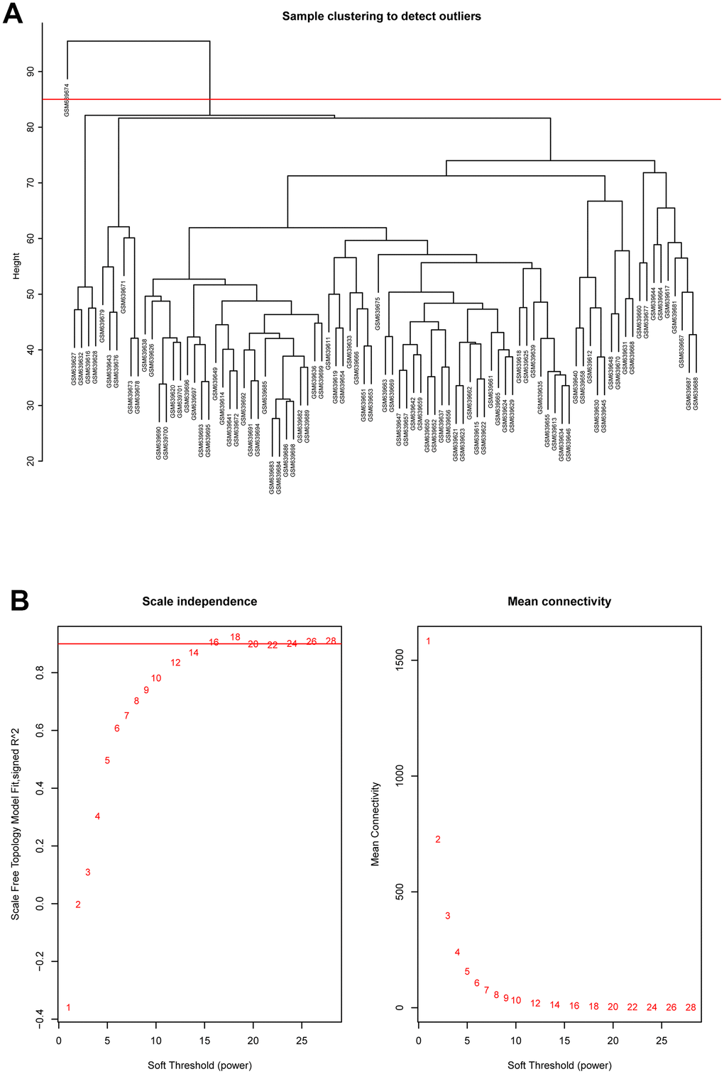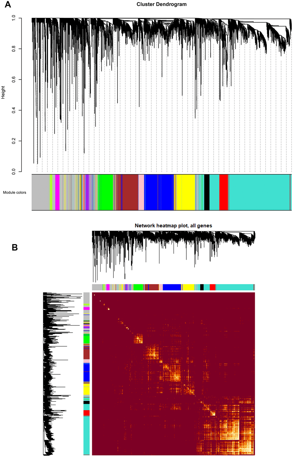WGCNA analysis was performed to identify corresponding expression modules. The process were conducted under R environment (“WGCNA” package [18]). First, hierarchical clustering analysis was applied to check the heterogeneity of samples to detect and eliminate the outliers. Second, clustering was performed according to gene expression levels in each sample to construct the network, to get access to the real biological network state (scale-free network). The soft threshold power was determined to select by computing a correlation value between every pair of genes, which could amplify disparity among strong and weak correlations, so that the network state could approach scale-free network topology. The optimal soft threshold power was selected when the scale-free topology index (R^2) reached 0.90 and mean connectivity approached 0.
