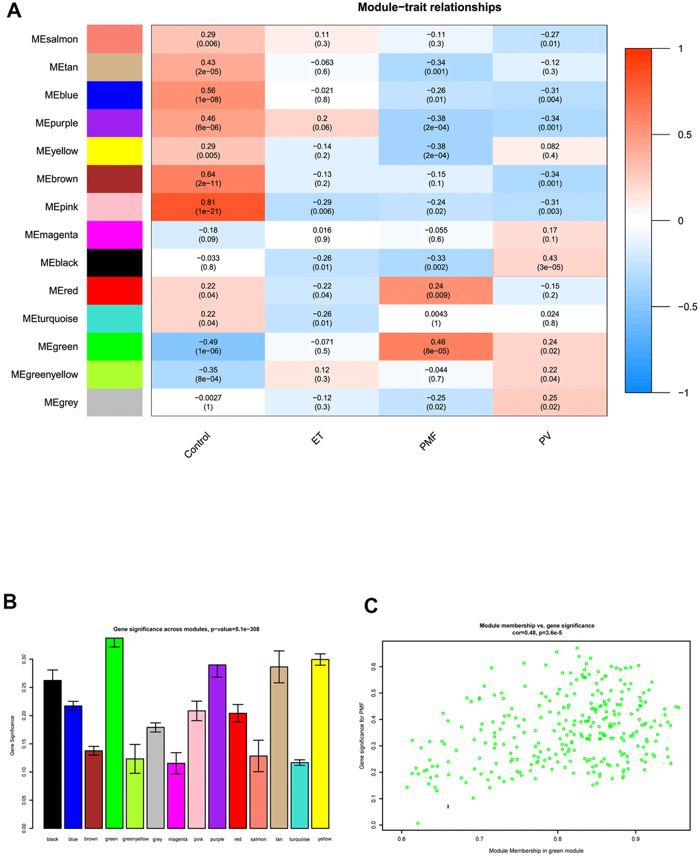 After the weighted co-expression network was constructed based on soft threshold power, hierarchical clustering was performed to visualize the subgroups of weighted network. Altogether, 14 distinct co-expression modules were generated, and each module contained the genes that had the most correlations with each other. After acquiring WGCNA network data, the module-trait heatmap was displayed, we observed that green module had the strongest positive correlation to PMF group, illustrating those genes in green module were crucial in the pathogenesis of PMF. Meanwhile, purple and yellow modules had a highly positive correlation in normal group, indicating that genes in these modules may benefit for the normal organism development. Additionally, the correlation in PV and ET groups were not as significant as PMF group (Figure 4A). Besides, hierarchical clustering analysis in green module visualized that genes expression level could significantly differentiate PMF group from other three groups (Figure 5C). These findings implied, consistent with previous studies, that PMF is the most major neoplasms in MPNs, later in their courses, both PV and ET disorders may be evolved into post-PV MF and post-ET MF due to gene mutation or over-expression [3, 4].
