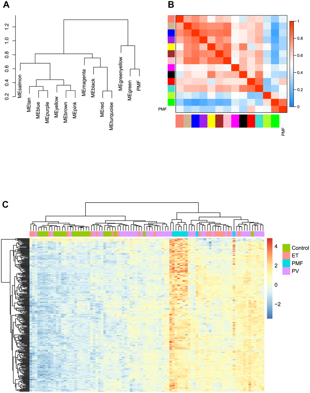 Next, weighted gene co-expression network was constructed based on the correlations of gene expression levels, and co-expression modules were identified by dynamic pruning method. The minimum number of genes in module was set as 30. Eigengenes adjacency was calculated to evaluate interaction of various gene modules. Module-trait relationships were estimated to identify the correlation between modules and PMF.