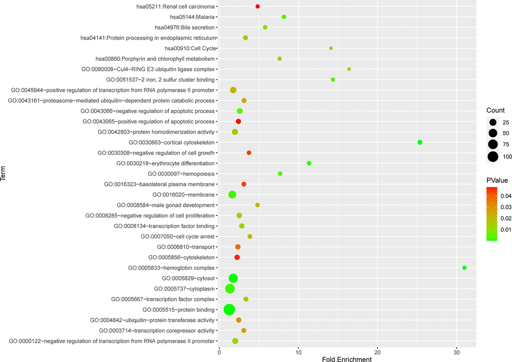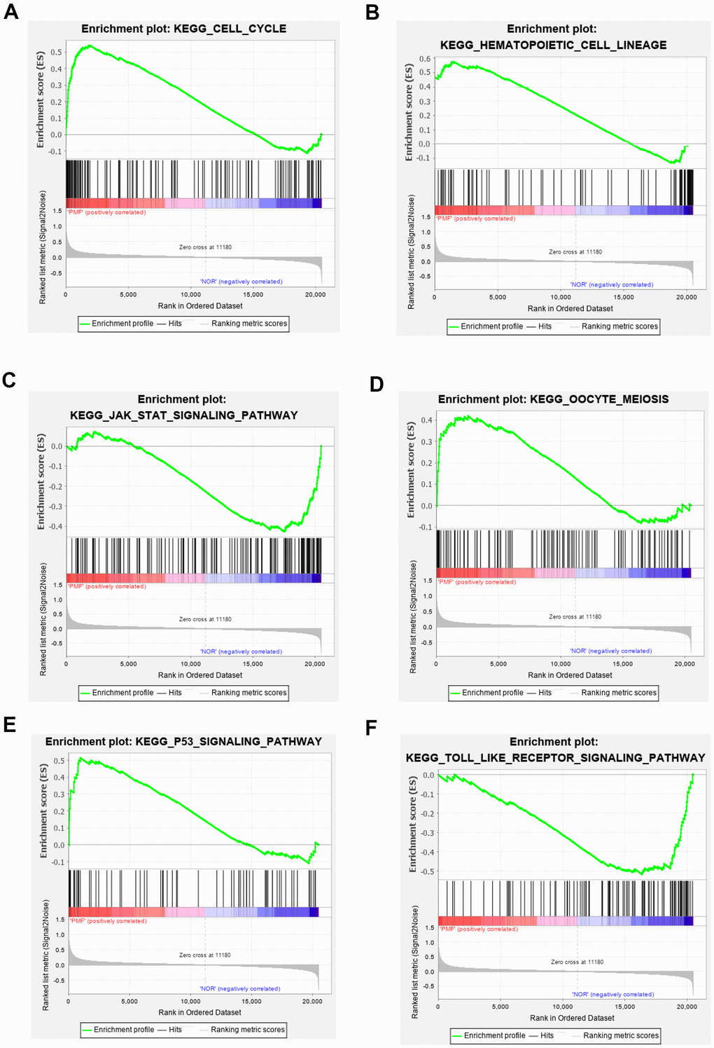 Totally green module contained 217 genes (as shown in Supplementary Table 1), to obtain a comprehensive understanding of the biological functions and aberrant signaling pathway of the genes in green module, GO, KEGG and GSEA methods were conducted. These genes were uploaded into DAVID database for BPs, MFs, and CCs analysis, the detailed results of GO, KEGG was shown in Table 1 and Figure 6. GO results indicated that these genes were mainly associated with several BPs including erythrocyte differentiation, hemopoiesis, positive regulation of transcription from RNA polymerase II promoter and negative regulation of apoptosis process, etc.; CCs including cytosol, hemoglobin complex, transcription factor complex, etc.; and several MFs such as protein binding, transcription factor binding, heme binding, etc. KEGG analysis revealed that some signaling pathways were significantly changed, such as cell cycle, protein processing in endoplasmic reticulum, bile secretion and porphyrin metabolism. As shown in Figure 7A–7F, GSEA results indicated that the mutual genes in green module were commonly evolved in critical signaling pathways that were correlated with carcinogenesis of tumor, including cell cycle, hematopoietic cell lineage, JAK-STAT signaling pathway, oocyte meiosis, P53 signaling pathway and toll-like receptor signaling pathway, etc.