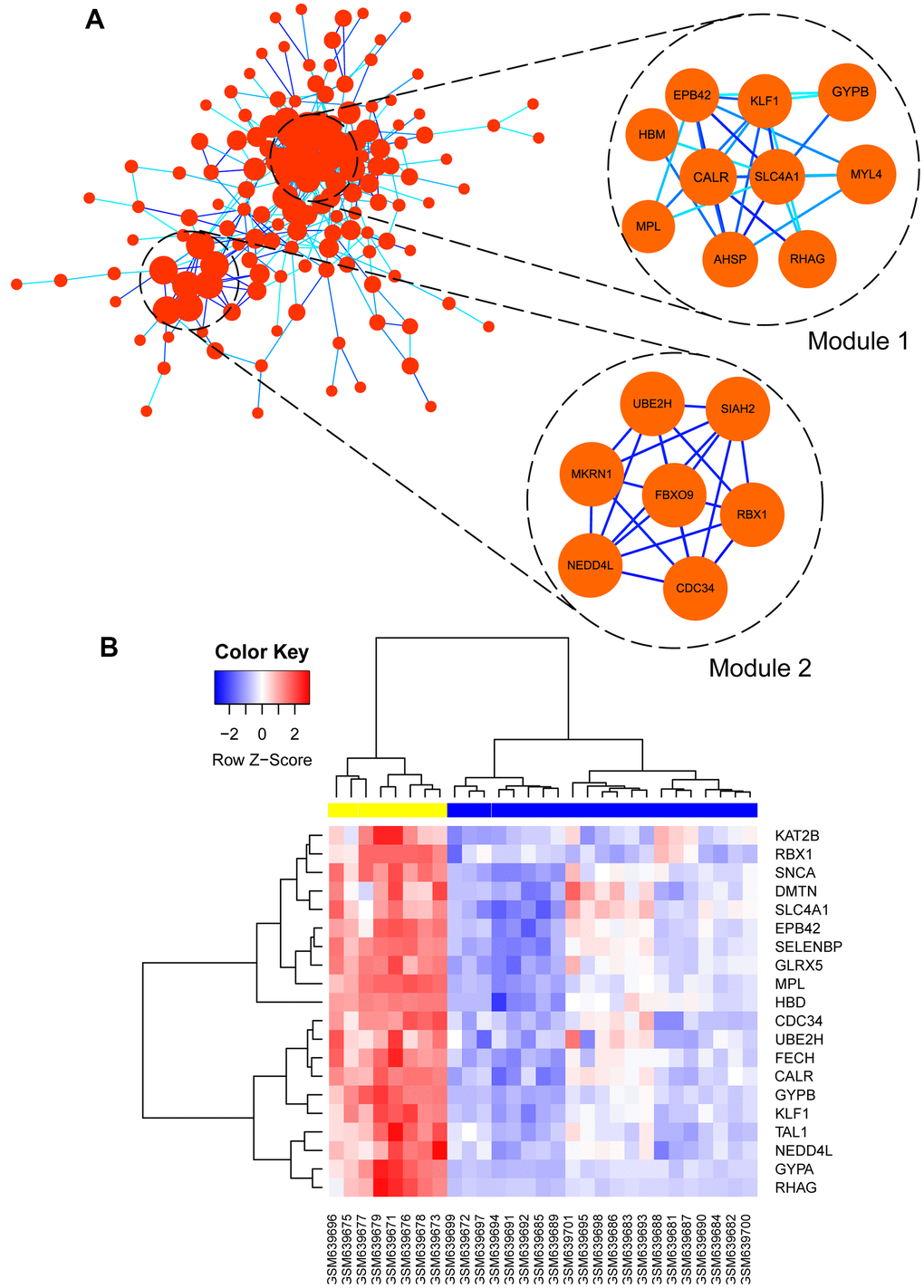 Subsequently, hub genes in this weighted network were filtered with degrees ≥ 36, degrees meant the level of correlation between two genes. Altogether, 20 genes were identified as hub genes including EPB42, SLC4A1, CALR, MPL, FECH, GYPB, KLF1, DMTN, RBX1, HBD, GYPA, GLRX5, UBE2H, KAT2B, RHAG, SELENBP1, CDC34, TAL1, NEDD4L, and SNCA, as listed in Table 3. Meanwhile, the gene expression levels of the hub genes between PMF and normal samples were tested, as shown in Figure 8B. Illustration elucidated that expression levels of these hub genes in PMF samples were much higher compared to normal samples, indicating that these genes were responsible for the development of PMF. Additionally, EPB42, CALR, SLC4A1 and MPL associated genes including HBM, KLF1, GYPB, MYL4, AHSP, RHAG were also expressed abnormally, which demonstrated that EPB42, CALR, SLC4A1 and MPL associated pathways were activated aberrantly.